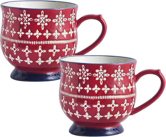 12 oz Coffee Mugs Set of 2, Embossment Cups Hand-Painted Floral Pattern Coffee Cups, Large Ceramic Mug Restaurant Coffee Mug with Handle for Coffee, Tea, Milk, Cocoa, Cereal, Yogurt (red)