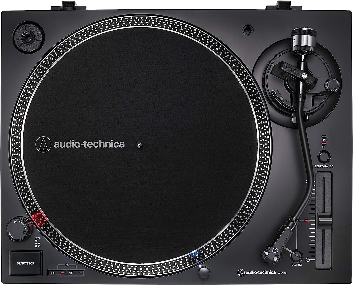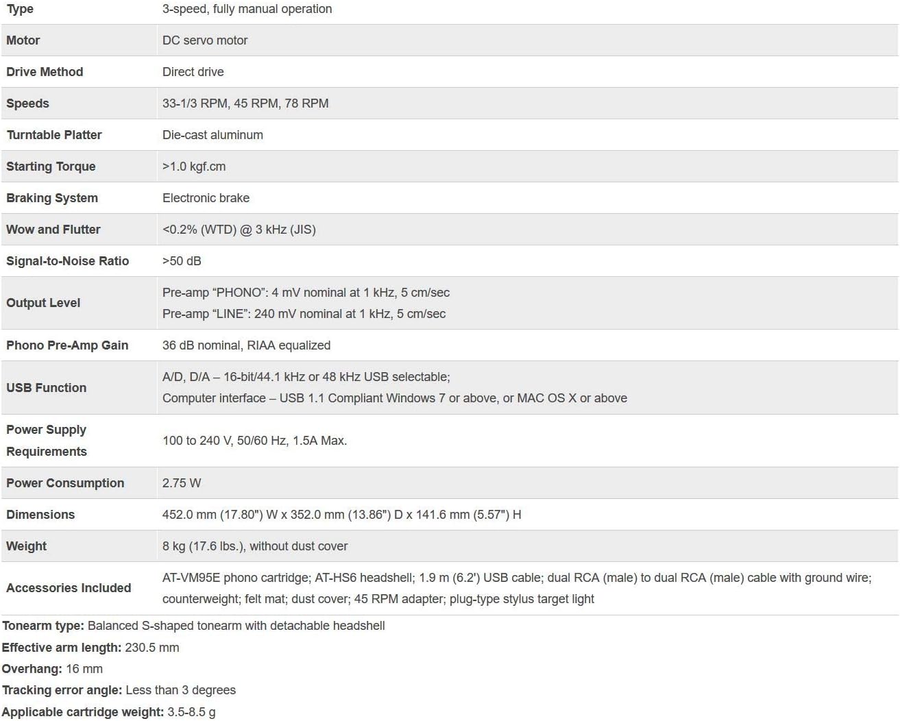 This black Audio-Technica AT-LP120XUSB-BK Analog and USB Direct Drive Turntable turntable features a DC servo direct-drive motor, along with adjustable dynamic anti-skate control and selectable phono preamplifier. The fully manual turntable plays 33-1/3, 45, and 78 RPM records and is equipped with a USB output that allows direct connection to your computer. Just download the free Mac- and PC-compatible Audacity recording software (or software of your choice) and start converting your records to digital audio files. In addition to the USB output, the turntable also comes with a detachable dual RCA output cable and is equipped with a built-in selectable phono preamp so you can connect directly to your home stereo, whether it has a dedicated phono input or not. The turntable features an S-shaped tonearm with adjustable tracking force and an AT-HS6 universal ½ in. mount headshell with an AT-VM95E Dual Magnet phono cartridge. Audio-Technica has been a leader in phono cartridge design for more than 50 years, and that expertise shows in the versatile, high-performance AT-VM95E cartridge, which comes with a 0.3 mil x 0.7 mil elliptical stylus, but is also compatible with any VM95 Series replacement stylus, offering a wide choice of options for every budget and application. Additional features include a die-cast aluminum platter with felt mat; a start/stop button; selectable high-accuracy quartz-controlled pitch lock and pitch change slider control with +/-8% or +/-16% adjustment ranges; a stroboscopic platter with speed indicator; a removable plug-type stylus target light; external power supply; and a removable hinged dust cover.