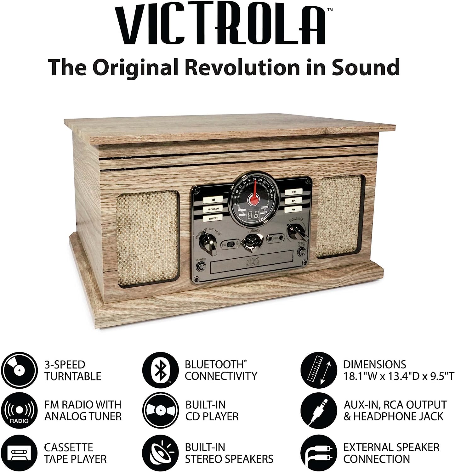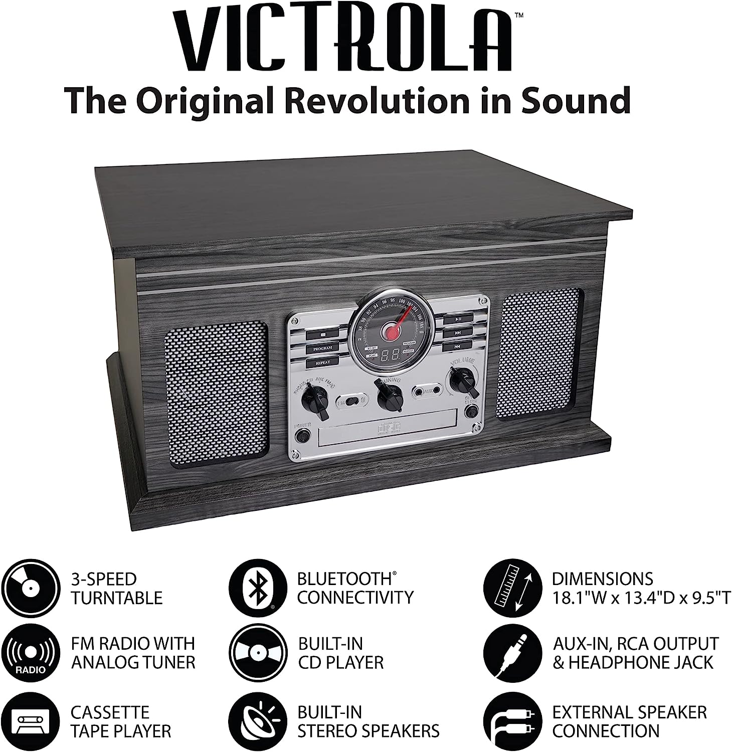Victrola Nostalgic 6-in-1 Bluetooth Record Player & Multimedia Center with Built-in Speakers - 3-Speed Turntable, CD & Cassette Player, AM/FM Radio | Wireless Music Streaming | Grey | wood