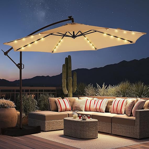 10ft Solar Lights Offset Cantilever Patio Umbrella - w/Light and Base, LED Lighted Offset Hanging Patio Outdoor Market Umbrella UPF50+ UV Protection with Easy Tilt and Crank (Beige)