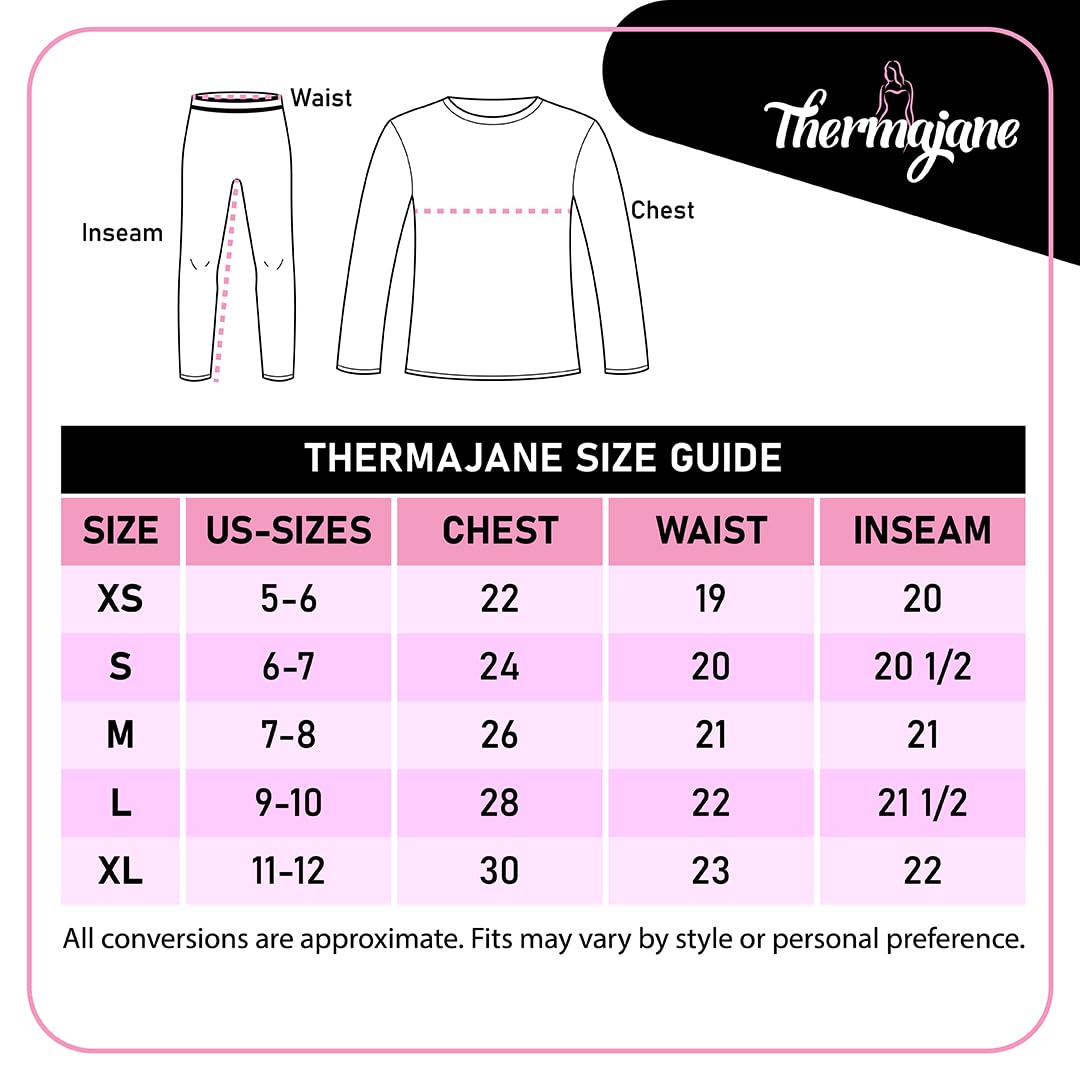 Details: Your child's comfort is always a priority, and ensuring their complete protection against the cold is an essential part of being a parent. Thermajane thermal underwear sets for girls are a perfect way to do this. Each complete set comprises of a thermal shirt along with thermal leggings that will keep your little girl warm from top to bottom. These thermal sets for children are made from the finest fabrics and are amazingly soft to the touch. Due to their intricate woven patterns, they promote insulation by trapping your body heat and will keep your girl consistently warm whether indoors or outdoors. These thermals are great as pajamas for bed and are a perfect base layer to keep your kid warm at school. They are also great if your girl wants to lounge around the house with you all day. Thermals will help your child adjust to the ever-changing weather conditions.
