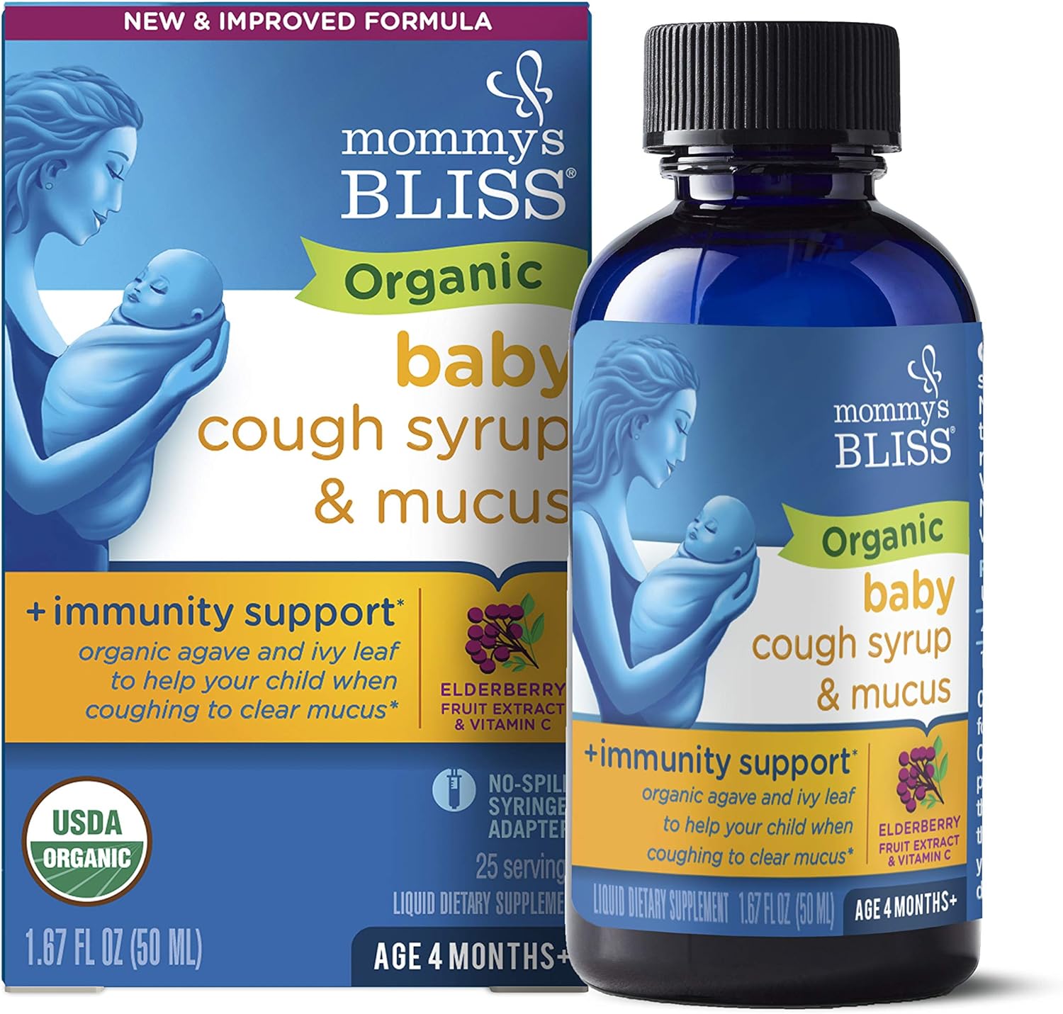 Mommy's Bliss Organic Baby Cough Syrup with Immunity Support offers organic relief for your child when occasional coughs hit. Our cough syrup supports their immunity, relieves discomfort, and helps you find your ultimate parenting bliss. This cough syrup is safe for babies 4 months and can help them when coughing to clear mucus, moisturize and protect their nasal passages, and support their immune system. It contains zero added sugar, alcohol, or artificial flavors or colors, and is also free of the top 8 allergens to avoid! Created for moms, by moms, Mommy's Bliss is made with gentle ingredients to safely bring families back to bliss.