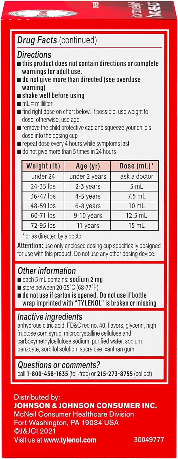 Intended for kids ages 2 to 11 years, Children's Tylenol Liquid Oral Suspension Medicine with Acetaminophen in a kid-friendly Cherry flavor provides temporary relief from a range of cold and flu symptoms, including fever, minor aches and pains, toothache, headache and sore throat. Each 5- milliliter dose of this kids' liquid medicine contains 160 milligrams of the pain reliever and fever reducer acetaminophen to temporarily reduce fever and help relieve minor aches and pains due to the common cold and flu. This children's cold and flu symptom medicine also comes in a kid-friendly cherry flavor and is ibuprofen-, aspirin- and alcohol-free, and is gentle on the tummy. From the #1 pediatrician recommended brand for pain and fever relief, Children's Tylenol has been used by parents decade after decade for effective symptom relief.