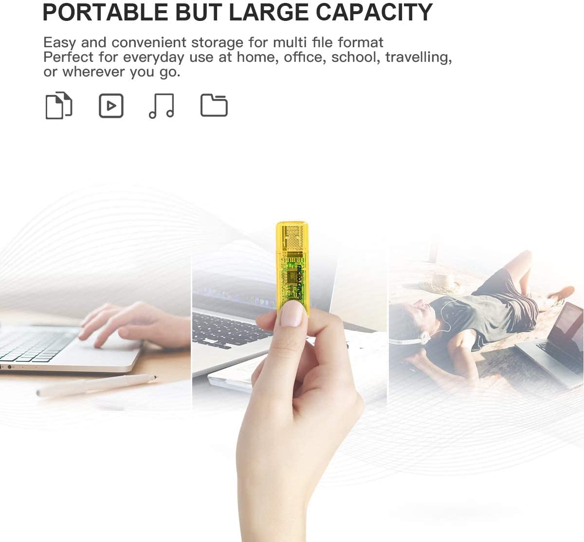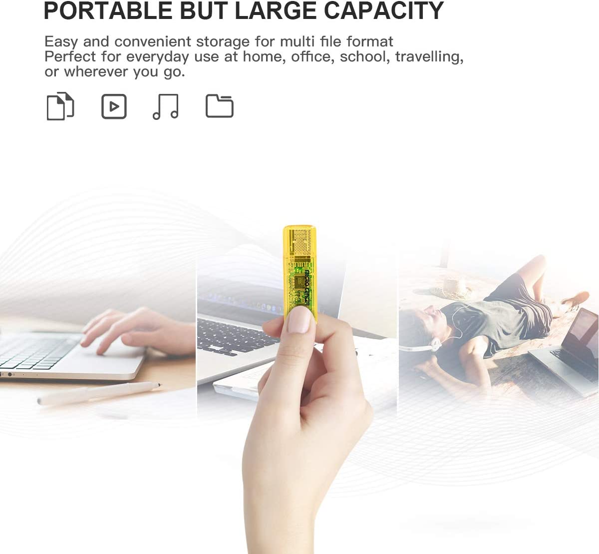 • SLIM FIGURE WITH LARGE STORAGE CAPACITY Gum size usb flash drive with 64GB capacity meets your daily needs in work, school, at home and while travelling. Digital storage for photos, music, videos, files and data transfer