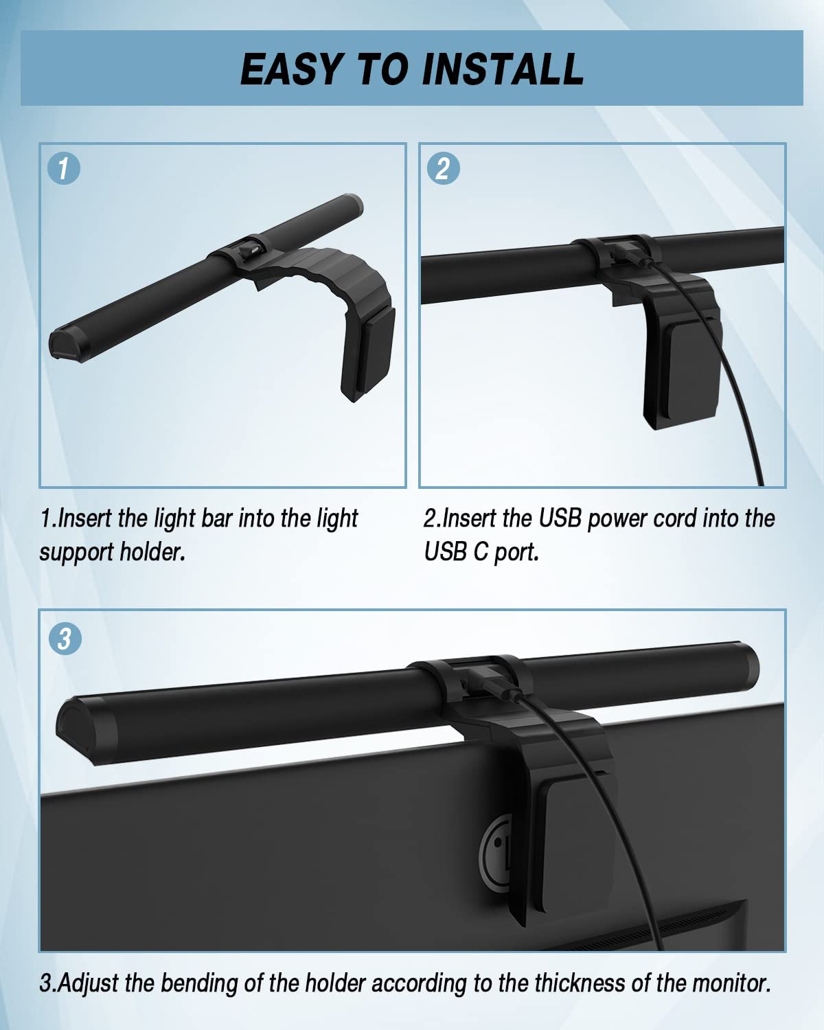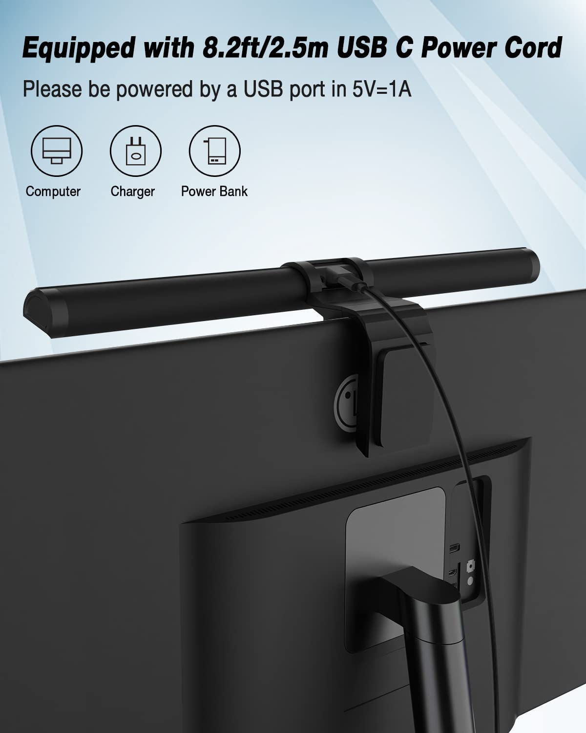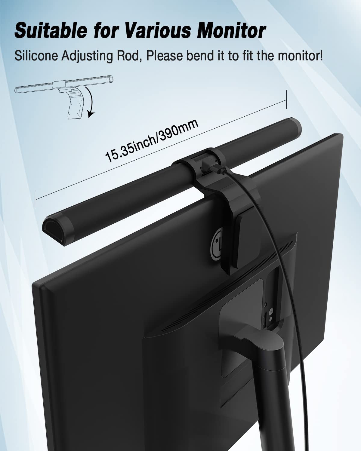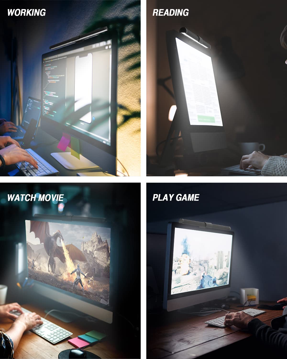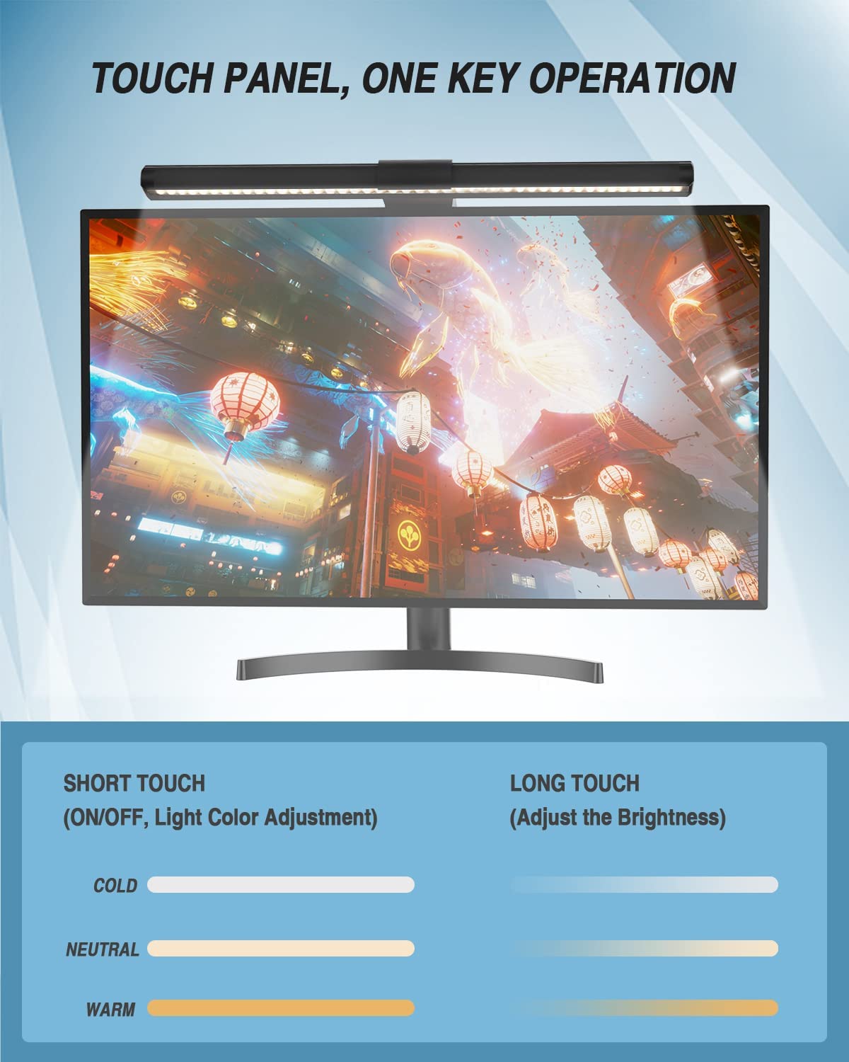 • 【Stepless Dimming & 3 Color Modes】You can adjust the hue and the brightness of monitor lamp base on the environment or your personal preference. Long press to adjust the brightness, from dim to bright. Short press to turn on or turn off, or change the 3 color modes(Warming Lighting/Natural Lighting/White Lighting).