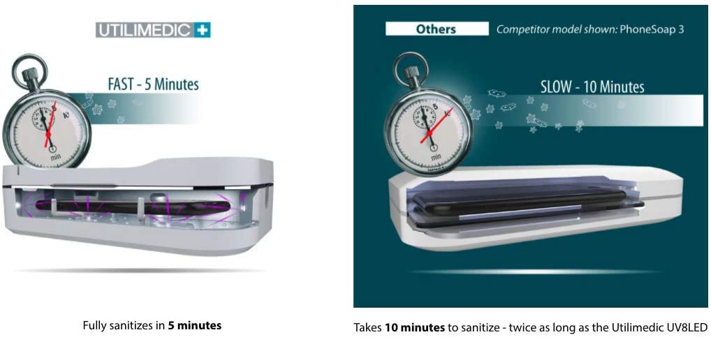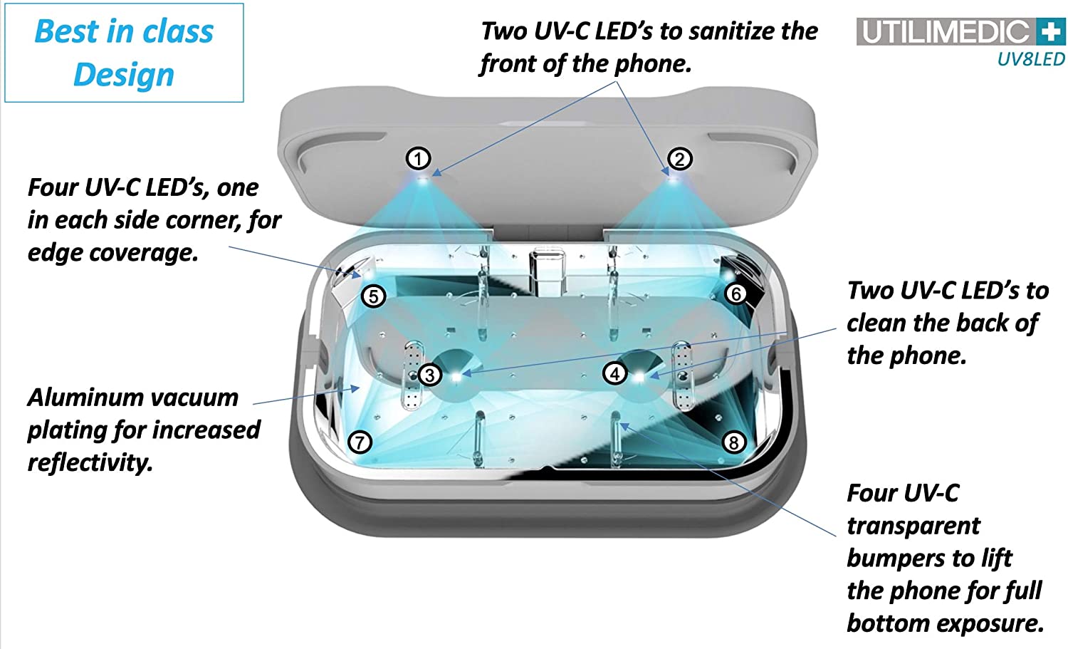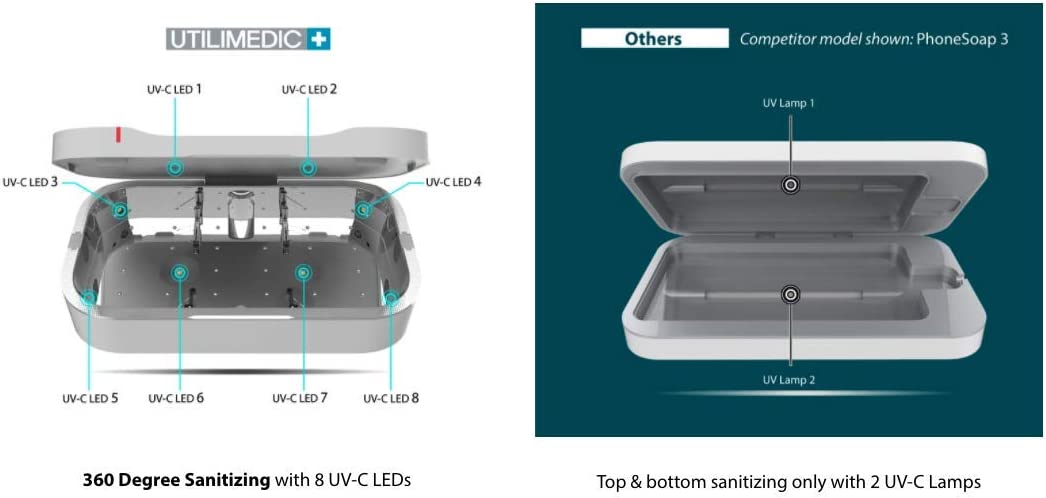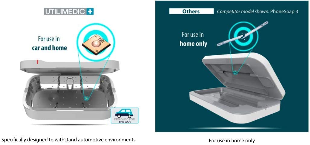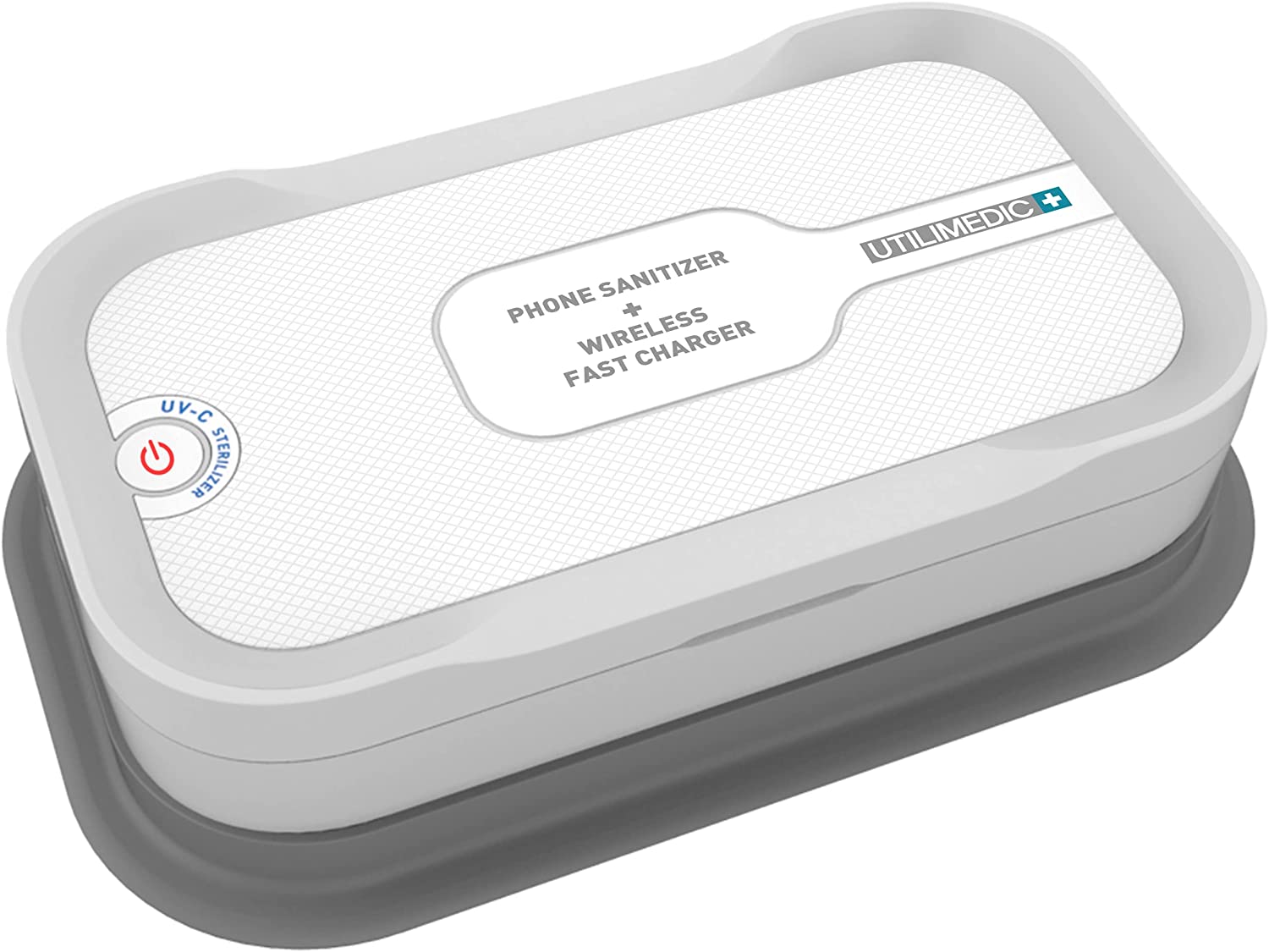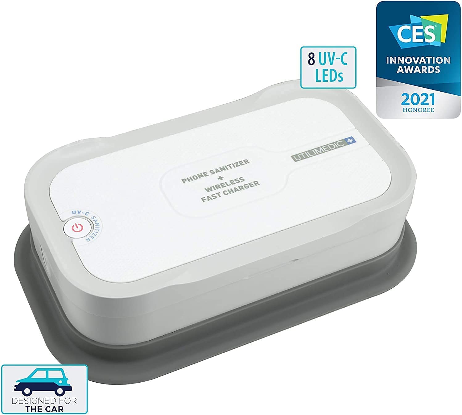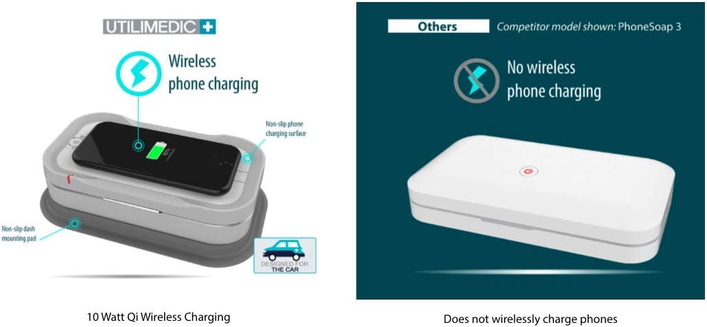 The Utilimedic UV8LED Phone Sanitizer for In-Car Use 8 UV-C LED lights eliminating 99.9% of Bacteria and Viruses Wireless Charging Pad is the best way to protect you and your family while on the road. This best in class car sanitizer was designed with eight UV-C LED lights producing 5mW per LED and 170 degrees of dispersion eliminating 99.9% of bacteria and viruses in 5 minutes. The inside compartment of your in-car sanitizer has four UV-C transparent bumpers built-in to lift the phone for full bottom exposure so that the eight UV-C LED’s can cover all surfaces of your phone or device effectively. Our engineers designed the UV8LED with a silicone pad to work seamlessly in a vehicle environment so you can feel safe and secure knowing that your belongings are bacteria and virus free as you run your errands. Not only does your car sanitizer eliminate the bacteria and viruses from your belongings it also does it while charging your phone. The UV8LED has a built-in wireless phone charger on the top so you can securely charge your phone and while your phone is getting disinfected it can also be charging via direct USB..