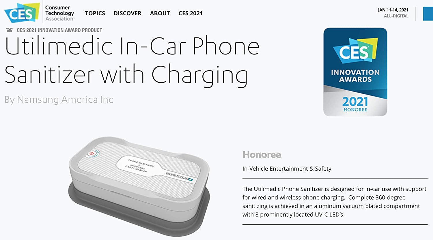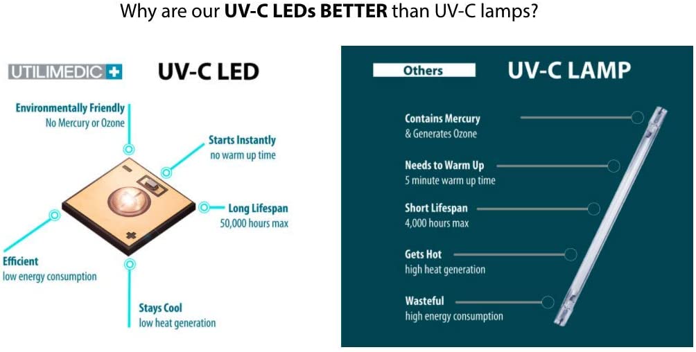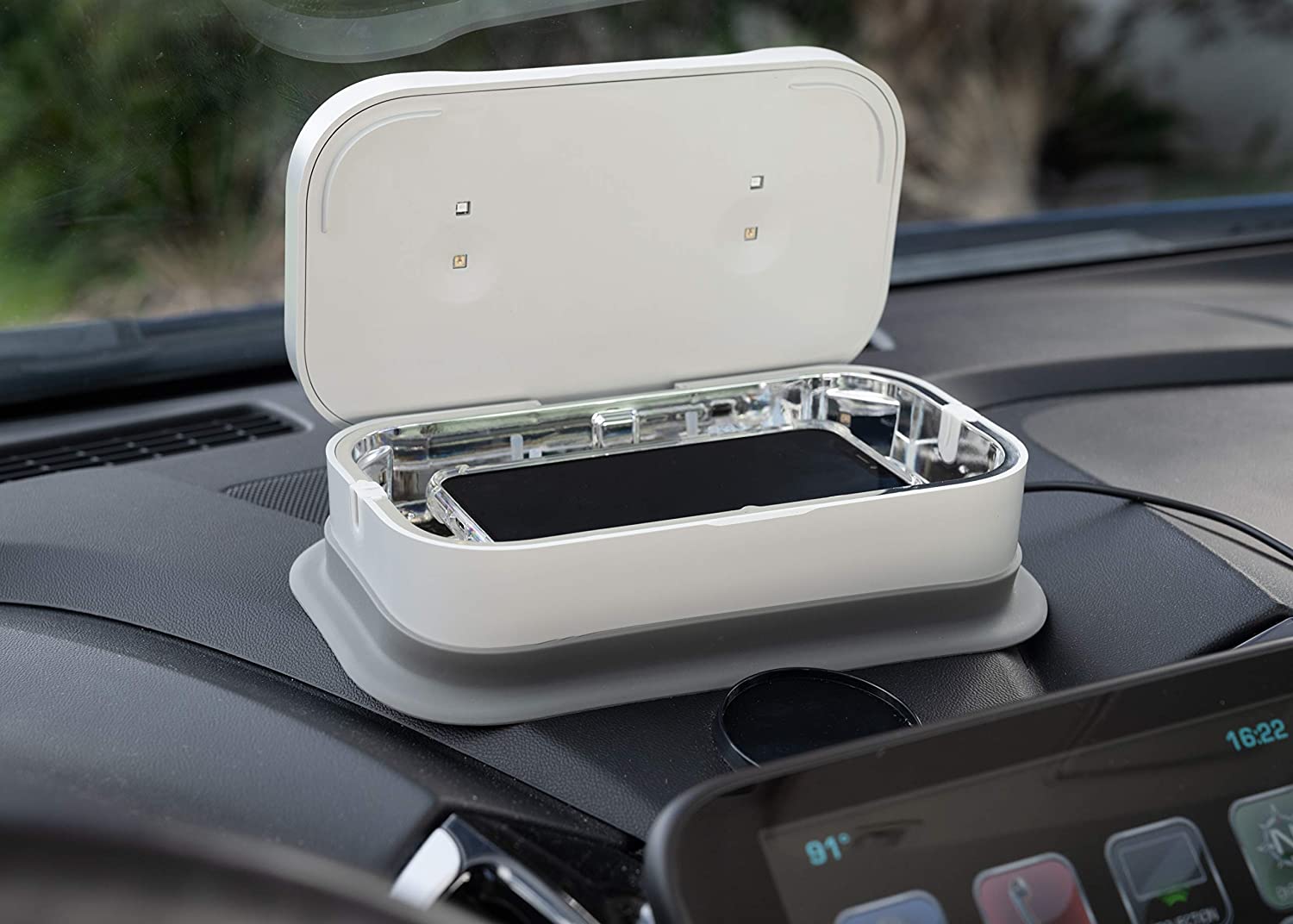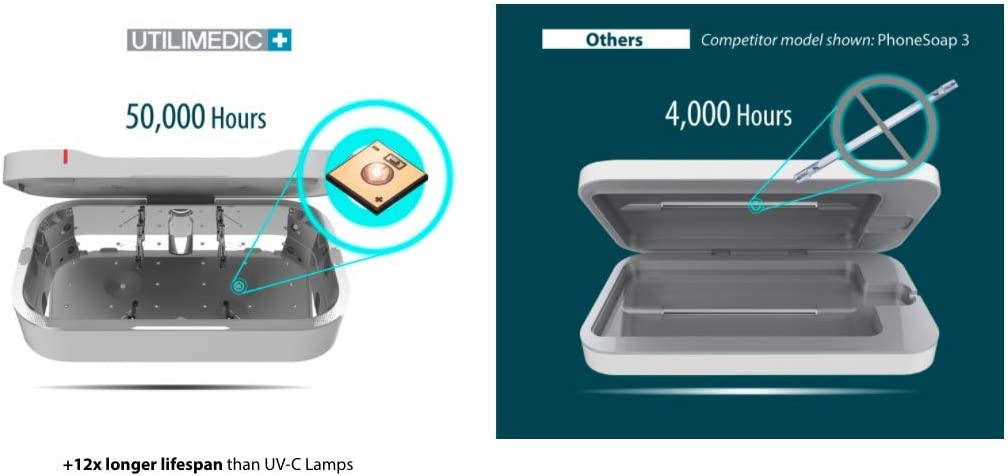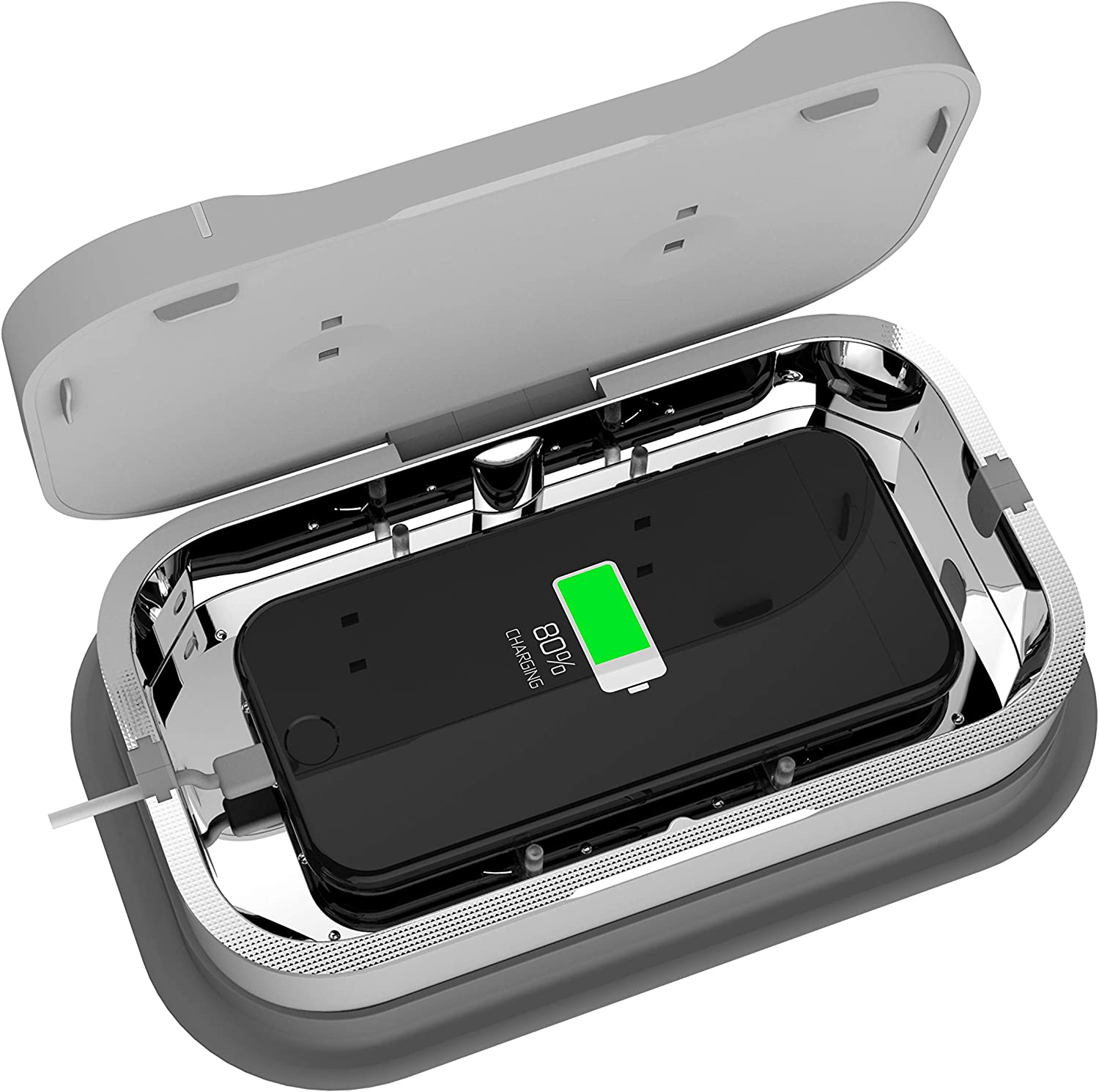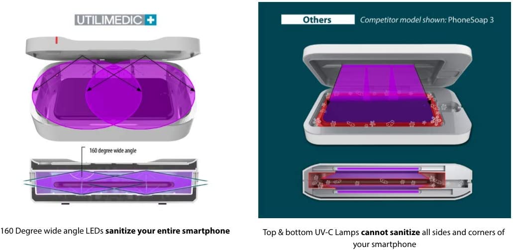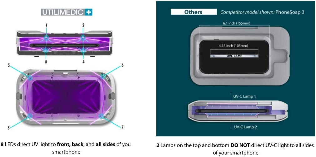The Utilimedic UV8LED Phone Sanitizer for In-Car Use 8 UV-C LED lights eliminating 99.9% of Bacteria and Viruses Wireless Charging Pad is the best way to protect you and your family while on the road. This best in class car sanitizer was designed with eight UV-C LED lights producing 5mW per LED and 170 degrees of dispersion eliminating 99.9% of bacteria and viruses in 5 minutes. The inside compartment of your in-car sanitizer has four UV-C transparent bumpers built-in to lift the phone for full bottom exposure so that the eight UV-C LED’s can cover all surfaces of your phone or device effectively. Our engineers designed the UV8LED with a silicone pad to work seamlessly in a vehicle environment so you can feel safe and secure knowing that your belongings are bacteria and virus free as you run your errands. Not only does your car sanitizer eliminate the bacteria and viruses from your belongings it also does it while charging your phone. The UV8LED has a built-in wireless phone charger on the top so you can securely charge your phone and while your phone is getting disinfected it can also be charging via direct USB..
