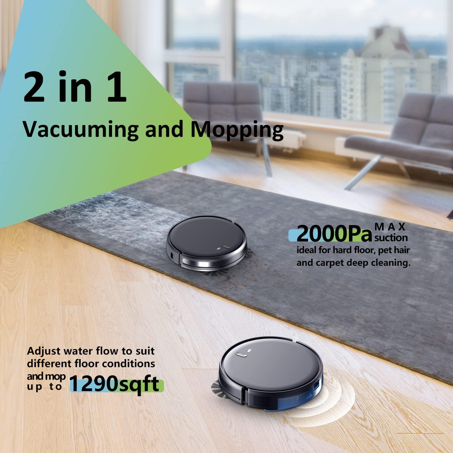 • [2-In-1 Mopping Robot Vacuum]: The 2000Pa mopping robot vacuum cleaner combo is applicable to floor tiles, tiles, wood, marble and other floors, carpets and hair; It is equipped with a 230ml water tank and mop pad, which can be used for both dust suction and mopping.