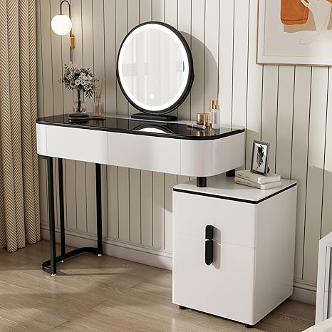 Furnistar Vanity Desk with 18" HD Mirror and Lights, 43" Glass Tabletop Makeup Vanity Table with 5 Drawers, Vanity Set 3 Lighting Modes Brightness Adjustable, White (Makeup Vanity)