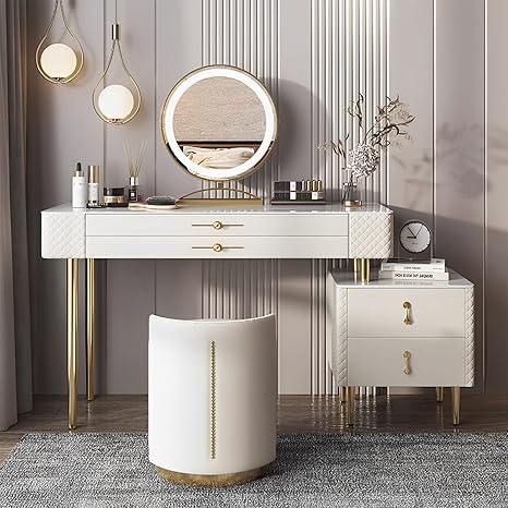 Vanity Set Desk with 4 Solid Wood Drawers, White Makeup Vanity with Mirror and Lights, Dresser Table with Free Retractable Side Cabinet, Simplicity Dressing Table with Microfiber Leather-47.2In