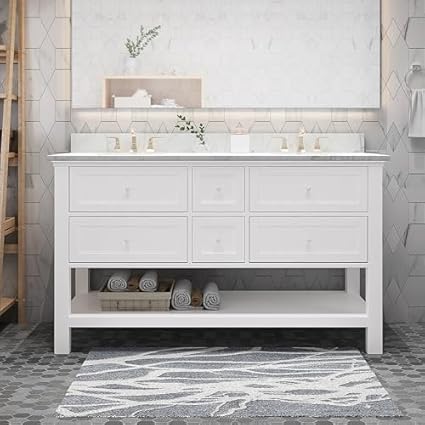 60 Inch Double Sink Bathroom Vanity with Marble Top and Sink Set, Solid Wood & Marble Bathroom Vanity Double Sink Cabinet with Drawers and Storage Shelf, Bathroom Vanities with Double Sink Set (White)