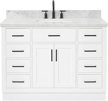 ARIEL Bathroom Vanity 49" White 1.5" Edge Italian Carrara Marble Countertop & Splash, Rectangular Sink, 2 Soft Closing Doors, 9 Full Extension Dovetail Drawers, Toe Kick, Matte Black