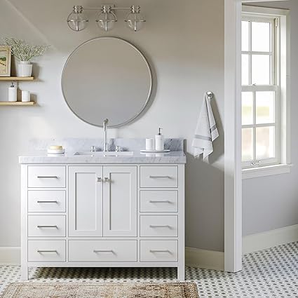 ARIEL Bathroom Vanity 48" White with 2" Edge Italian Carrara Marble Countertop & Backsplash, Center Rectangular Sink, 2 Soft Closing Doors, 9 Full Extension Dovetail Drawers, Brushed Nickel