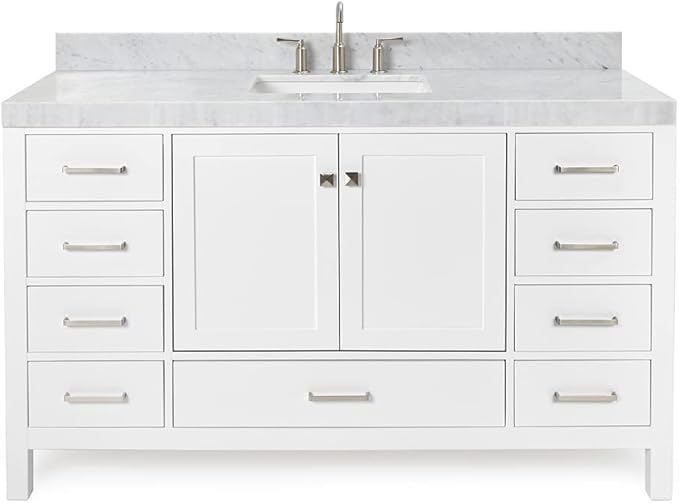 ARIEL Bathroom Vanity 60" White with 2" Edge Italian Carrara Marble Countertop & Backsplash, Center Rectangular Sink, 2 Soft Closing Doors, 9 Full Extension Dovetail Drawers, Brushed Nickel