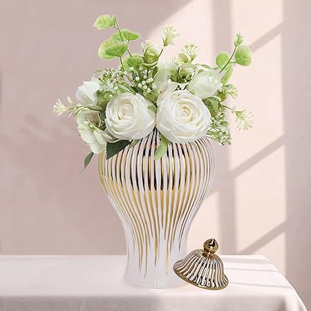 16.5''Ginger Jar, White and Gold Ceramic Vase with Lid, Large Decorative Tea Storage Jar Table Center Vase for Home, Office, Table, Living Room, Bookshelf, Mantle Fireplace (40cm/16.5in)