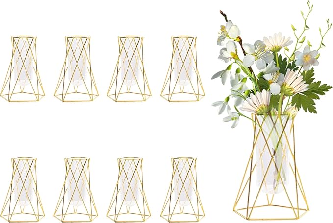 8 Pcs Gold Geometric Vase for Centerpieces, 6.3 Inch Glass Vase with Metal Flower Stand Hydroponic Plant Test Tube Vase Modern Vase for Wedding Home Decor