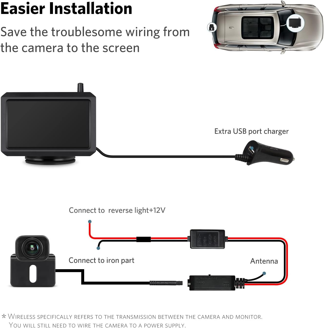 • 【Easier Installation: Free up Your Time】 K7 car backup camera wireless is transmitted wirelessly, and no wiring is required between the back up camera and monitor, which is the most troublesome part of installing a rear camera. (*Wireless back up system refers to the transmission between the camera and monitor. You will still need to wire the camera to a power supply.)