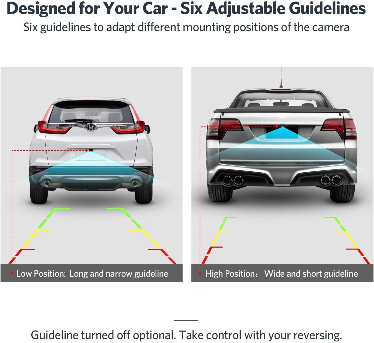 • 【High Compatibility: Universal Rear View Camera】 Want a backup camera for truck? As long as you have a 12V power supply and a cigarette socket! Some features also expand its usefulness, like mirror/normal picture, adjustable camera angle, and adjustable guidelines. You can install this reverse camera on vehicles, like pickups, trucks, cargo vans, trailers, and small classes of RVs.