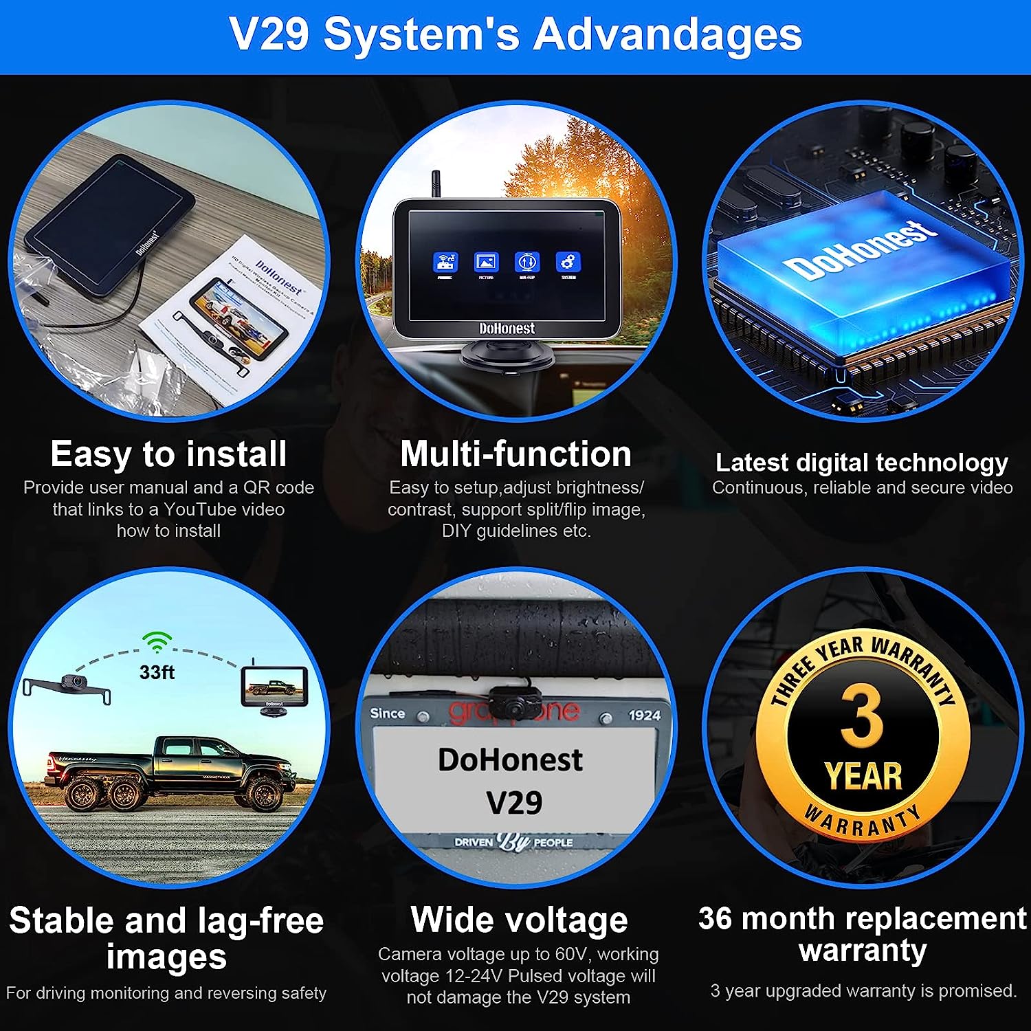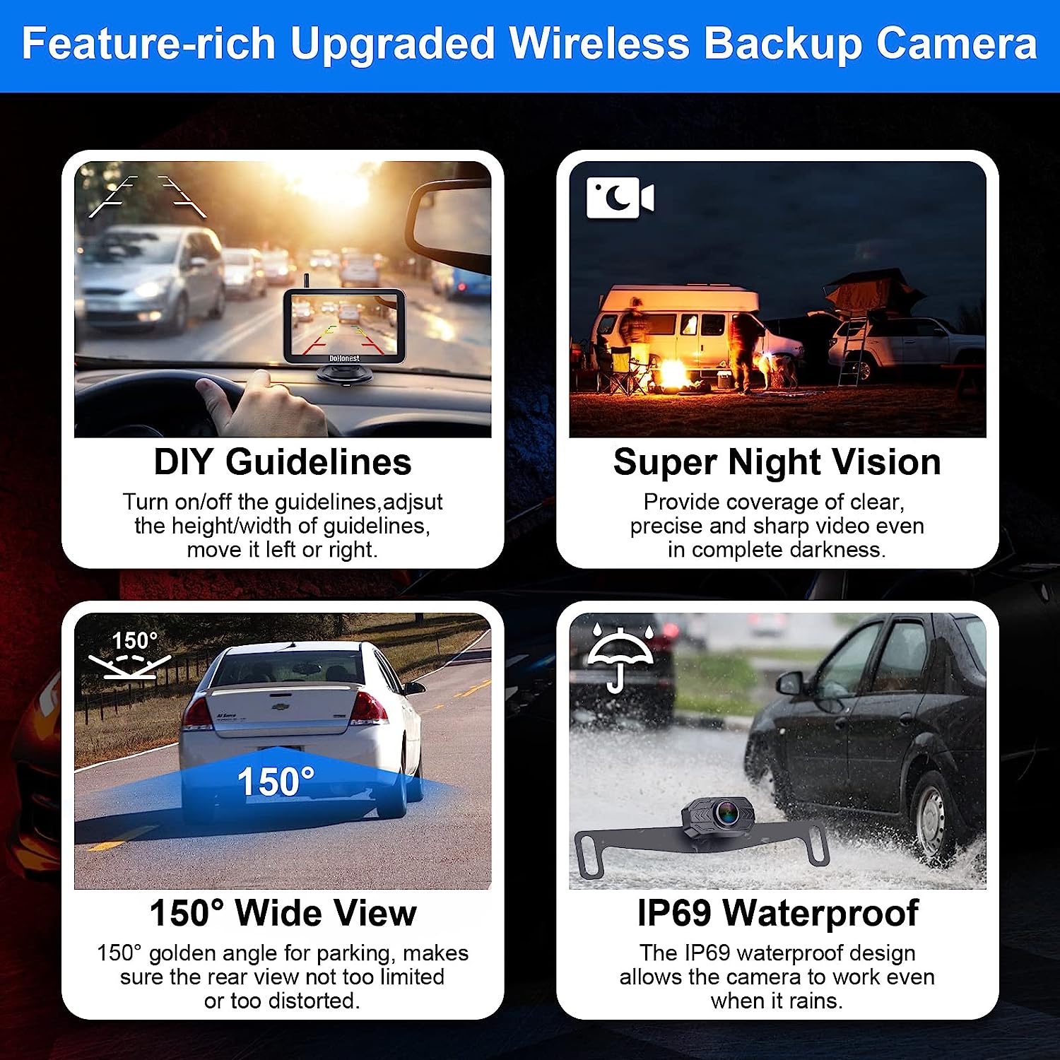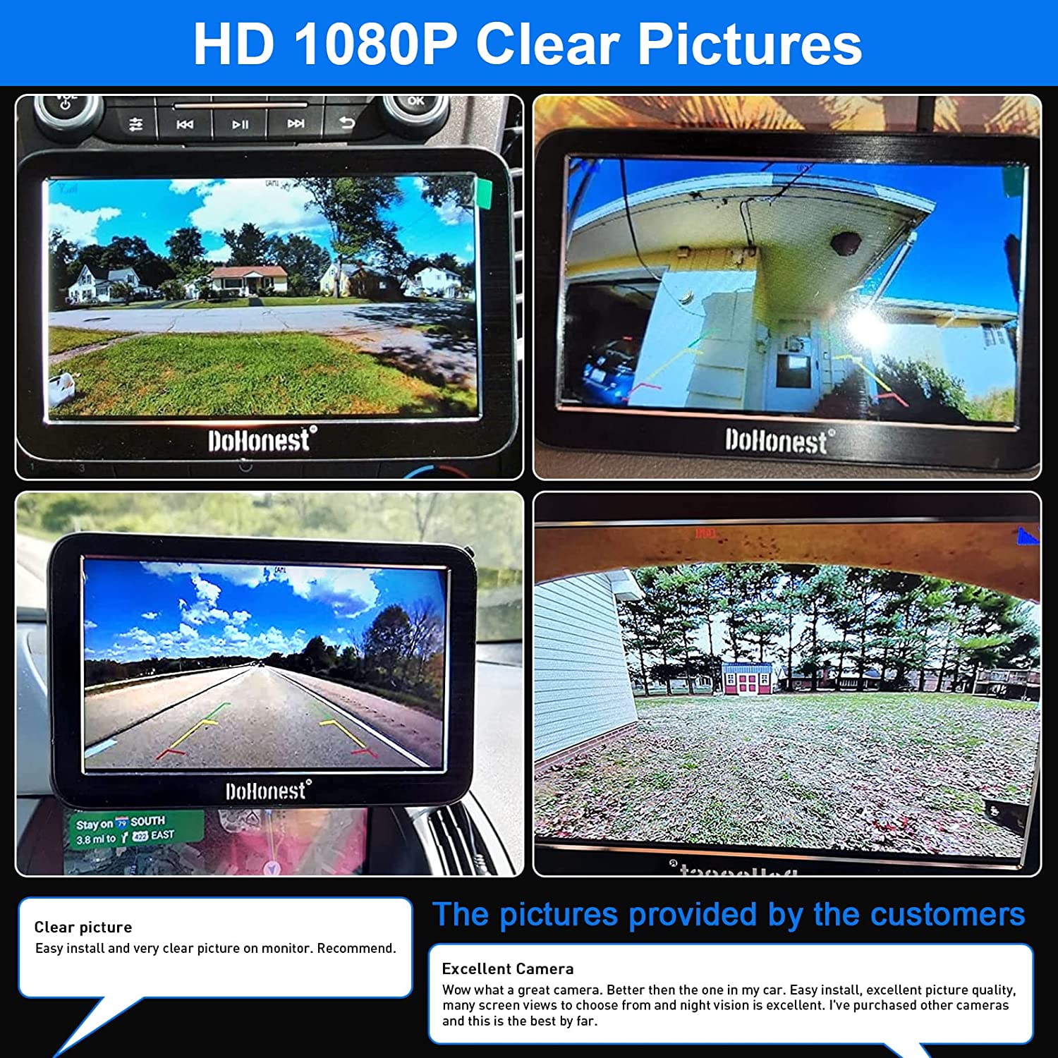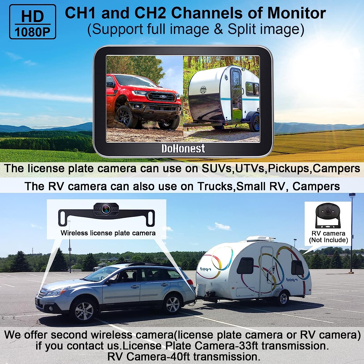 • ★Good Service - The rv backup camera wireless system is suitable with cars,vans,camping cars, trucks, small RVs. DoHonest offers clear user guide (installation video included), 45-day money back guarantee and 3 year warranty. 24 hours after-sales service and Professional technician team is available. If there's any issue, just contact us.