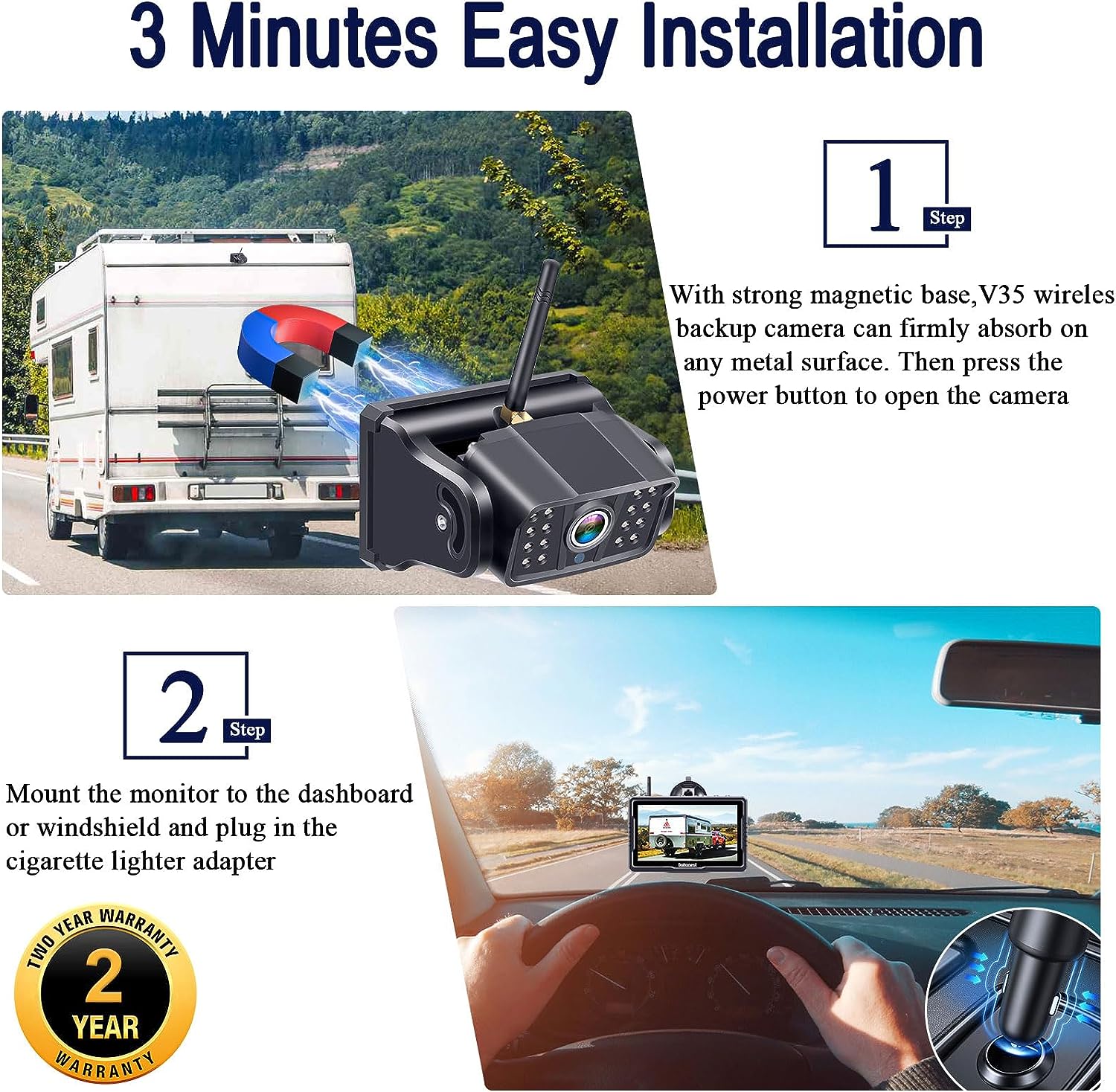 • Strong Stable Signal: Using the latest digital chip,V35 wireless backup camera for trailer boasts a 36ft digital wireless range within vehicle. The trailer backup camera wireless perfects for jeep truck/pickup/car/camper/voyager RV/horse trailer/fifth wheel/SUV/van/tractor/boat ect.
