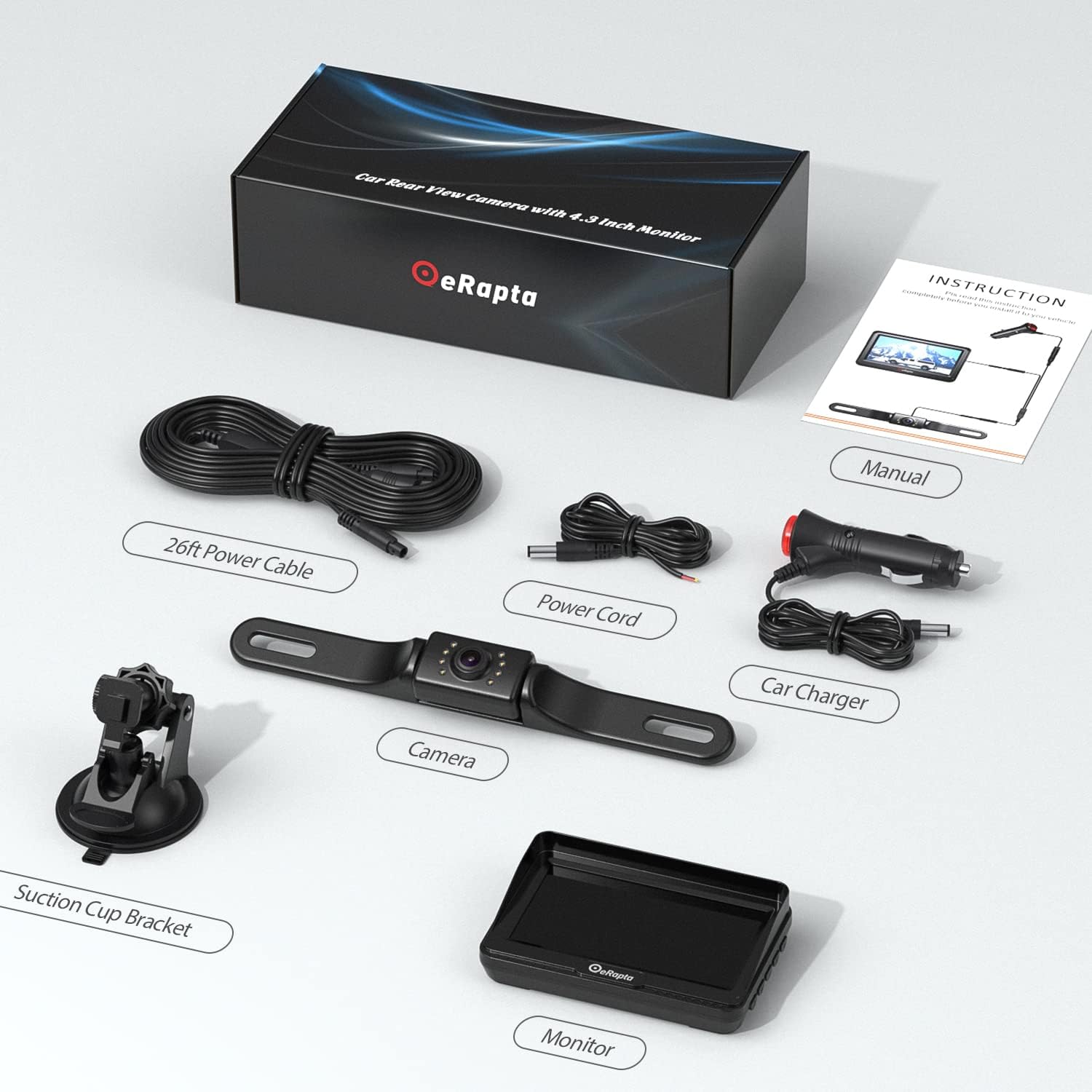 • In the Box & Two-year Warranty: 1x Monitor, 1x Camera, 1x 26ft Extension cable, 1x Car Charger, 1x Power Cable 2 x Brackets. The reversing camera comes with a two year warranty and lifetime technical support.eRapta support department will always be there for any consultation.