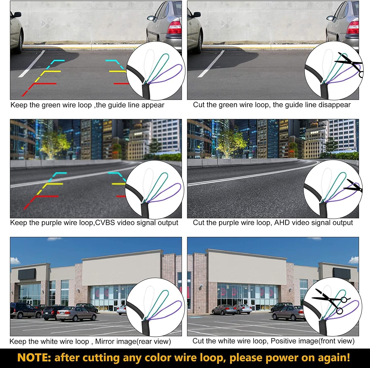 • Car backup camera's housing is metal,2 in 1 installation option design(surface or flush mount option).Also it is built in 3 multifunctional switching loops: cut the white loop for front view, cut the green loop to remove the guidelines and cut the purple loop to choose AHD format(AHD,720P,30fps)video signal output.