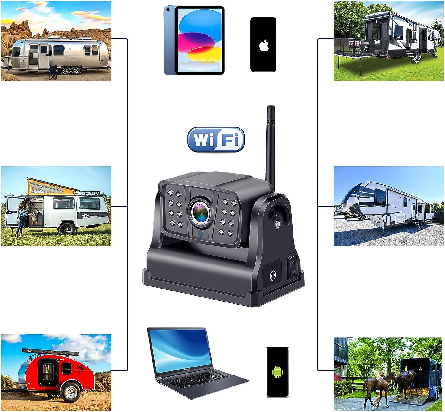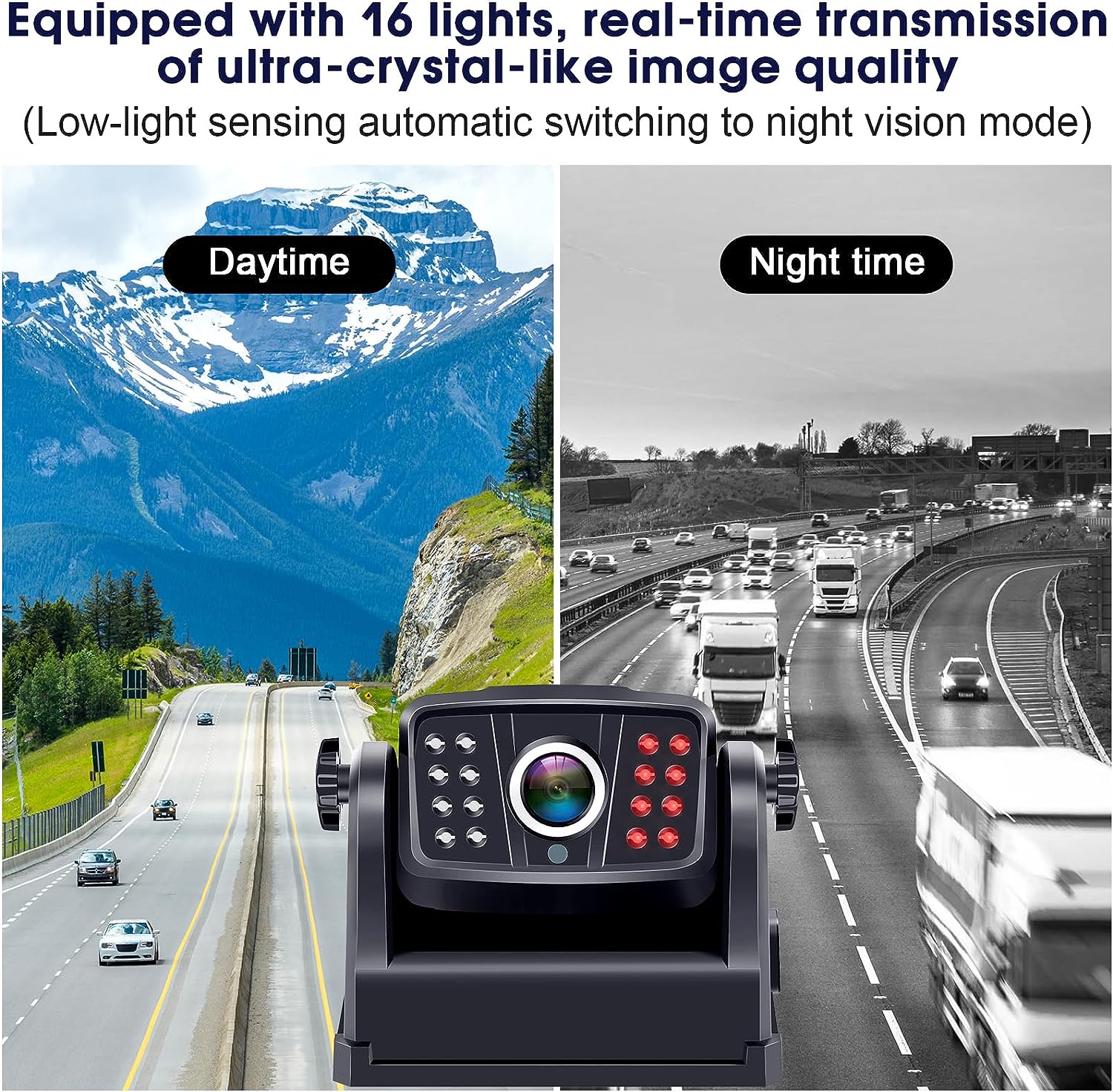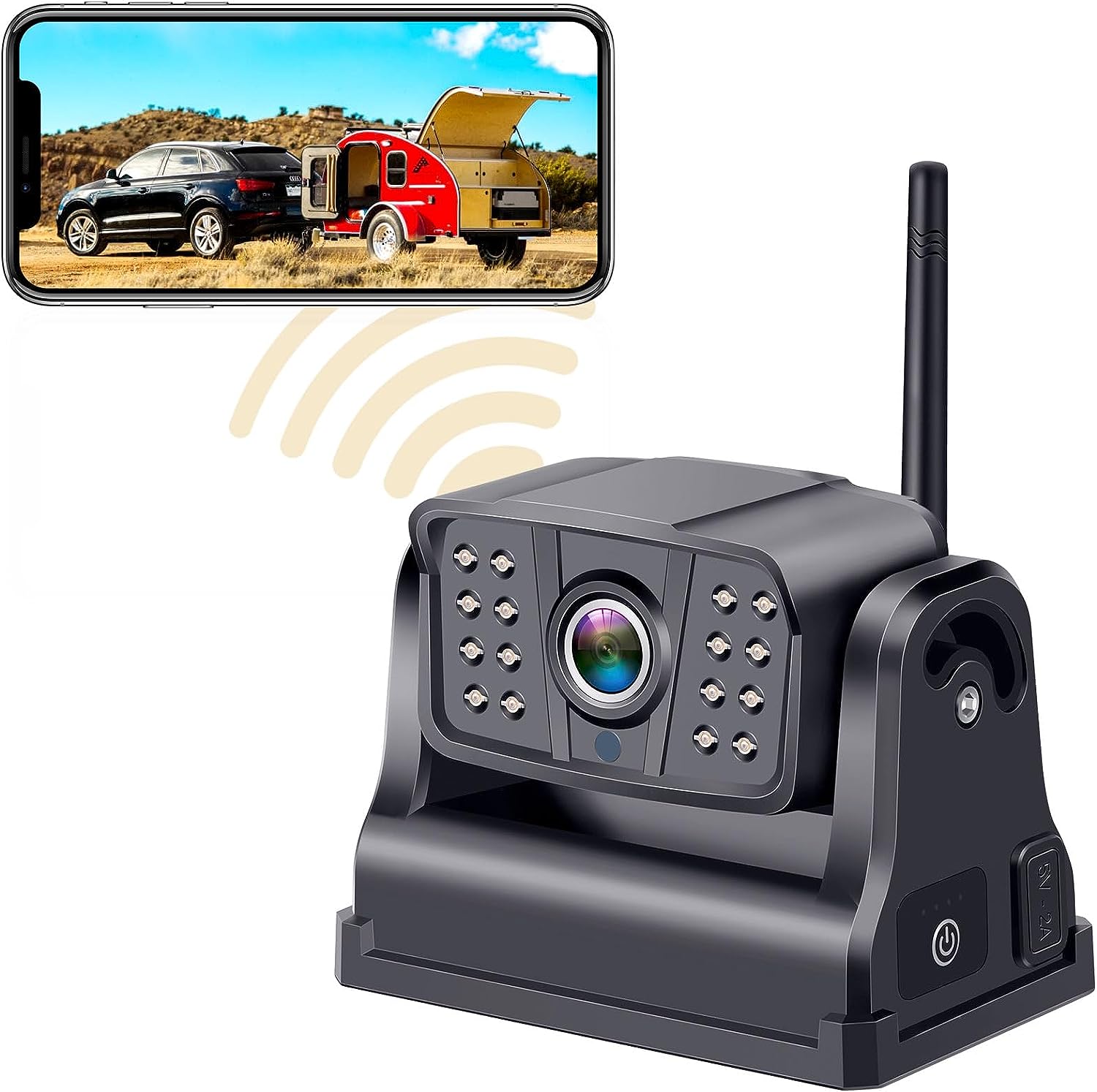 • [Clear Day & Night Vision]: Equipped with 16 IR night vision lights and a 150° front/rear viewing angle, our rv backup camera wireless provides high-quality image display that accurately identifies targets and provides maximum security, day or night.