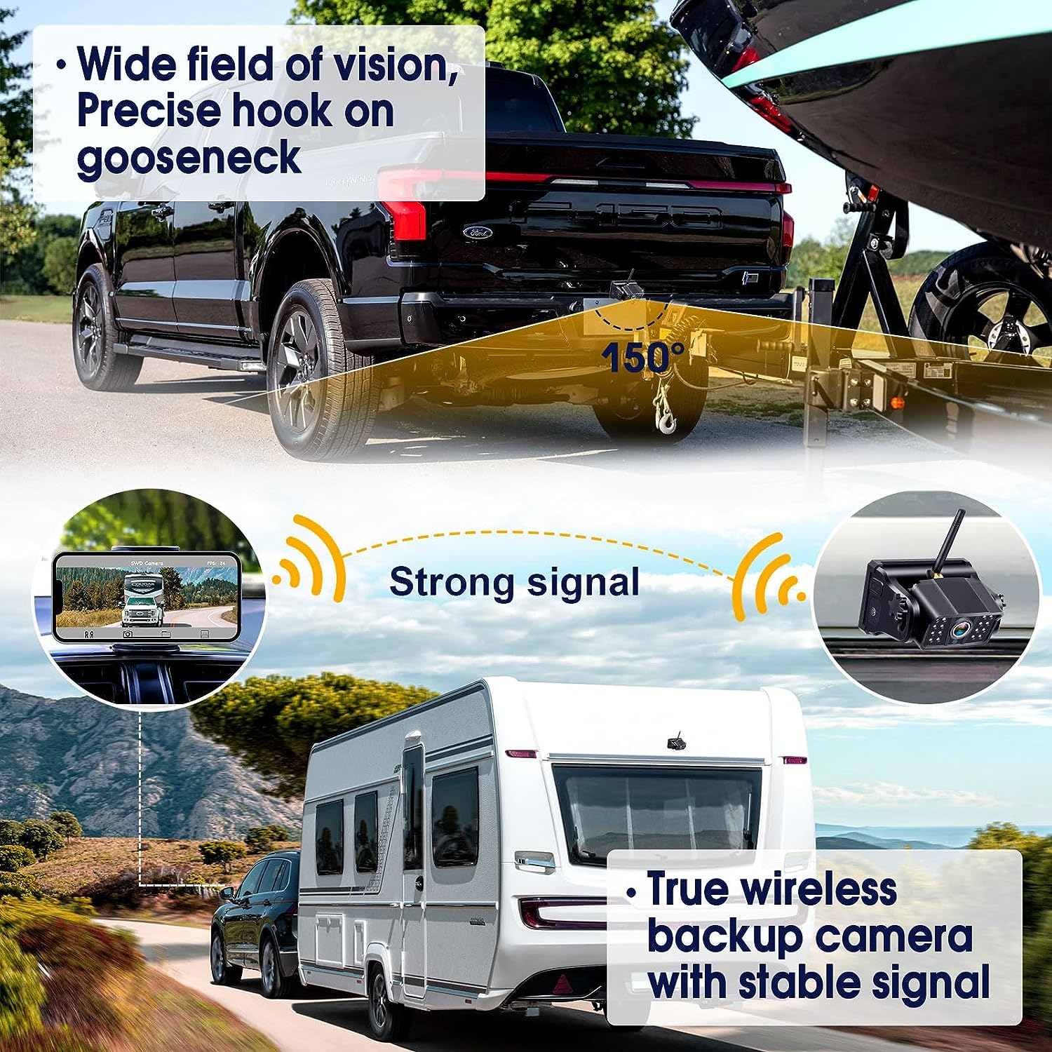 • [Robust Wireless Signal]: This wireless backup camera for car provides a stable, uninterrupted digital signal, even when mounted on a 30 feet trailer.