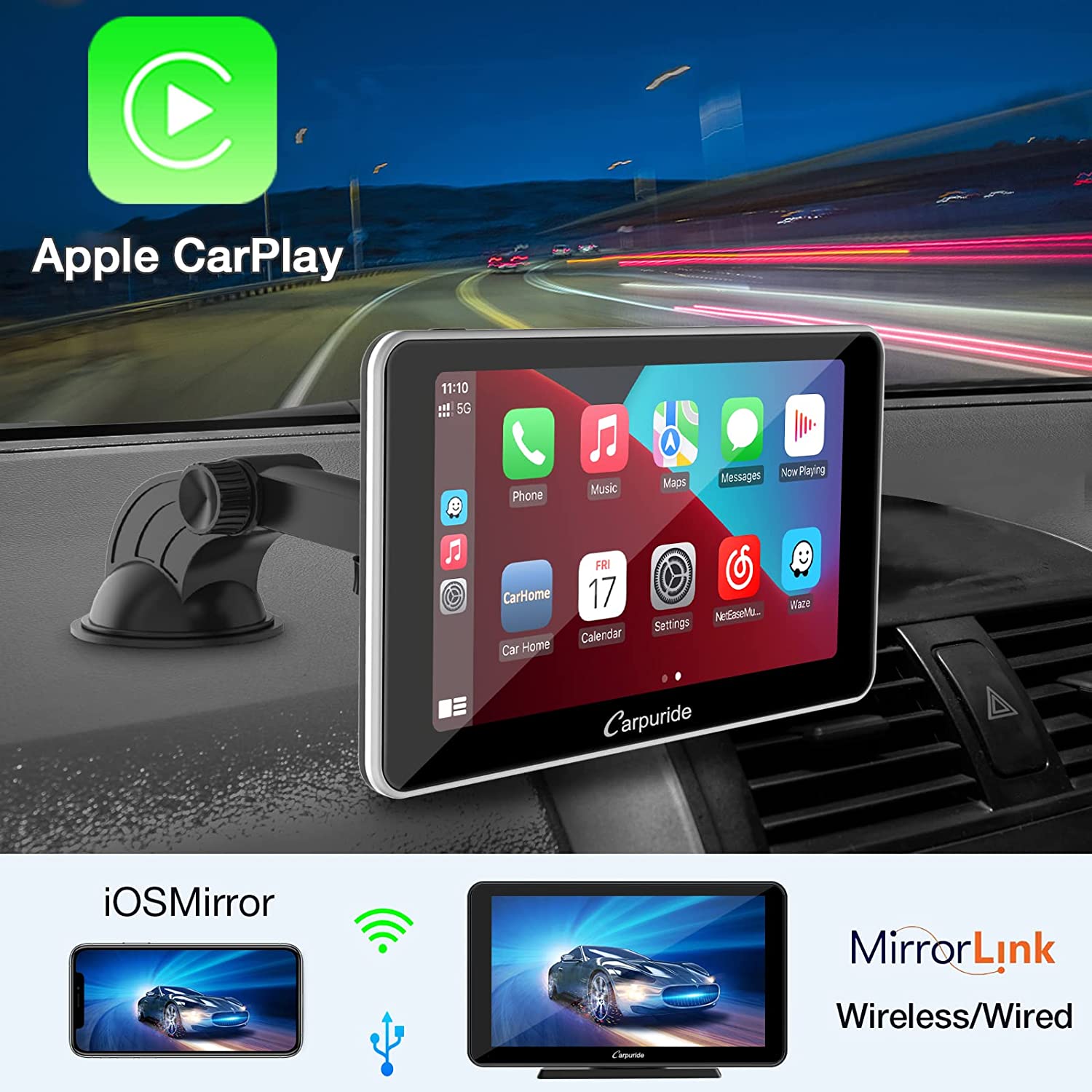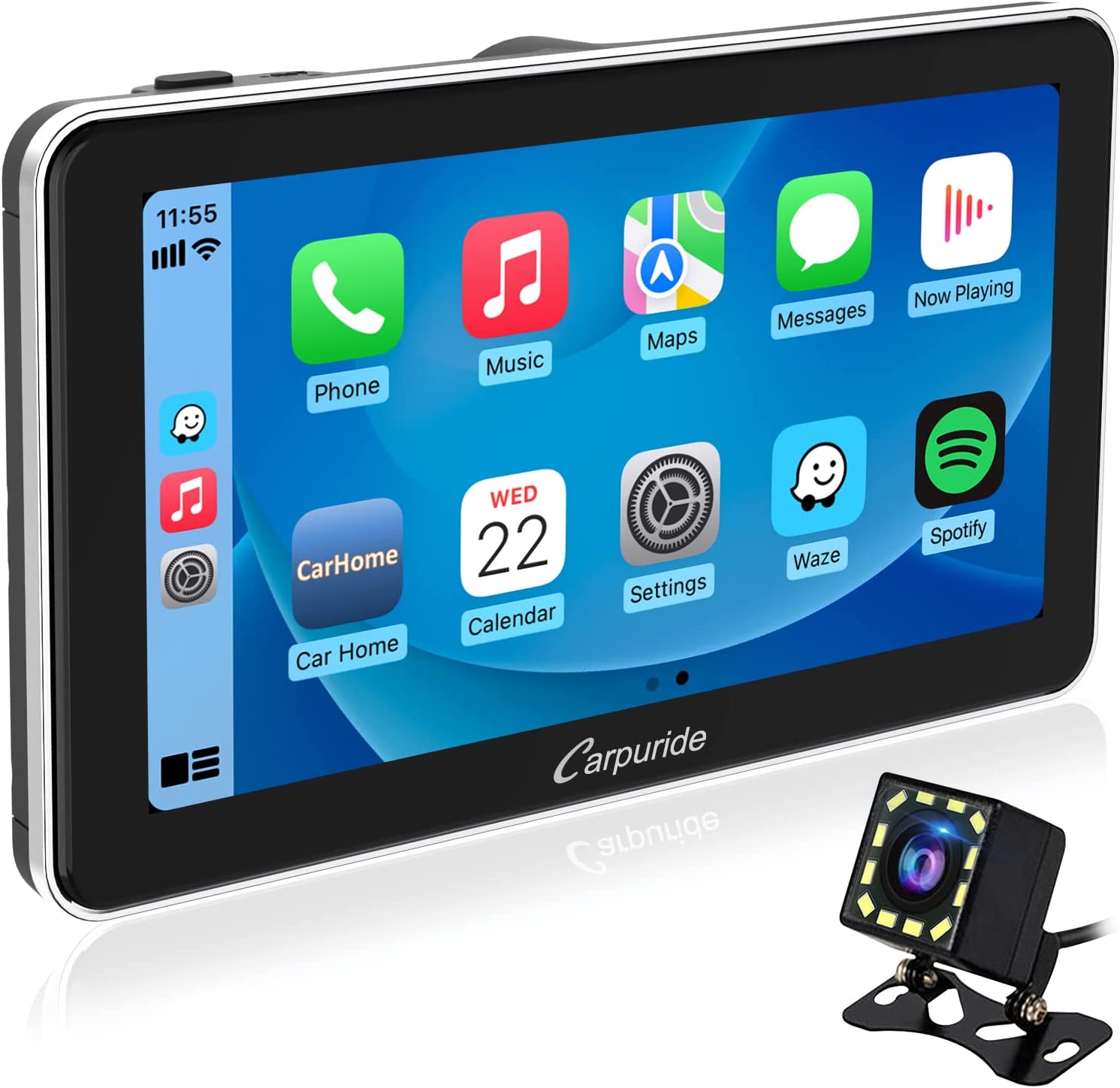 Carpuride Newest w701 Wireless Portable Apple Carplay & Android Auto, 7 inch IPS Touchscreen with Backup Camera,Bluetooth 5.0/ Mirror Link/GPS/Siri/Mic, Dash Windshield Mounted