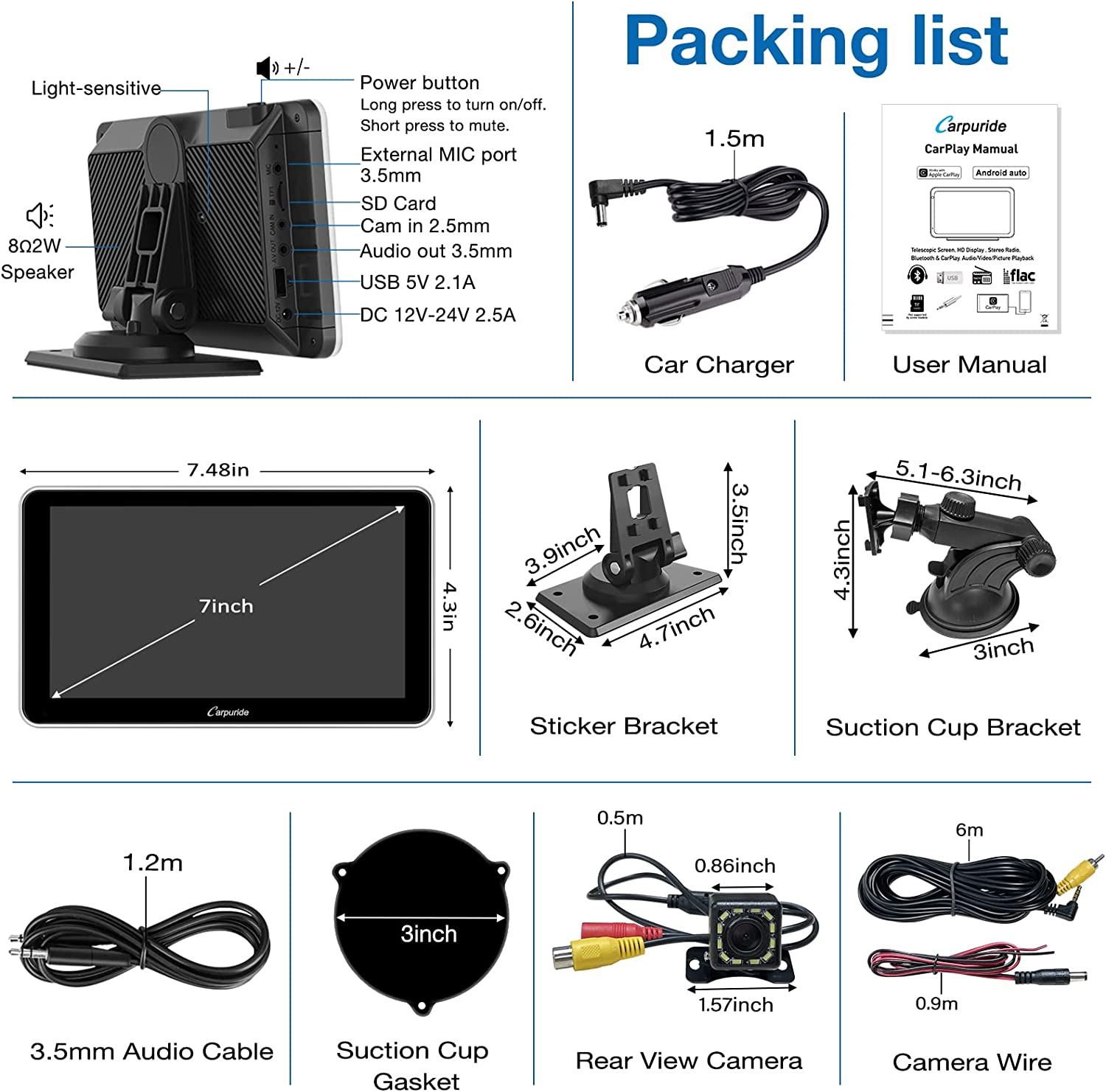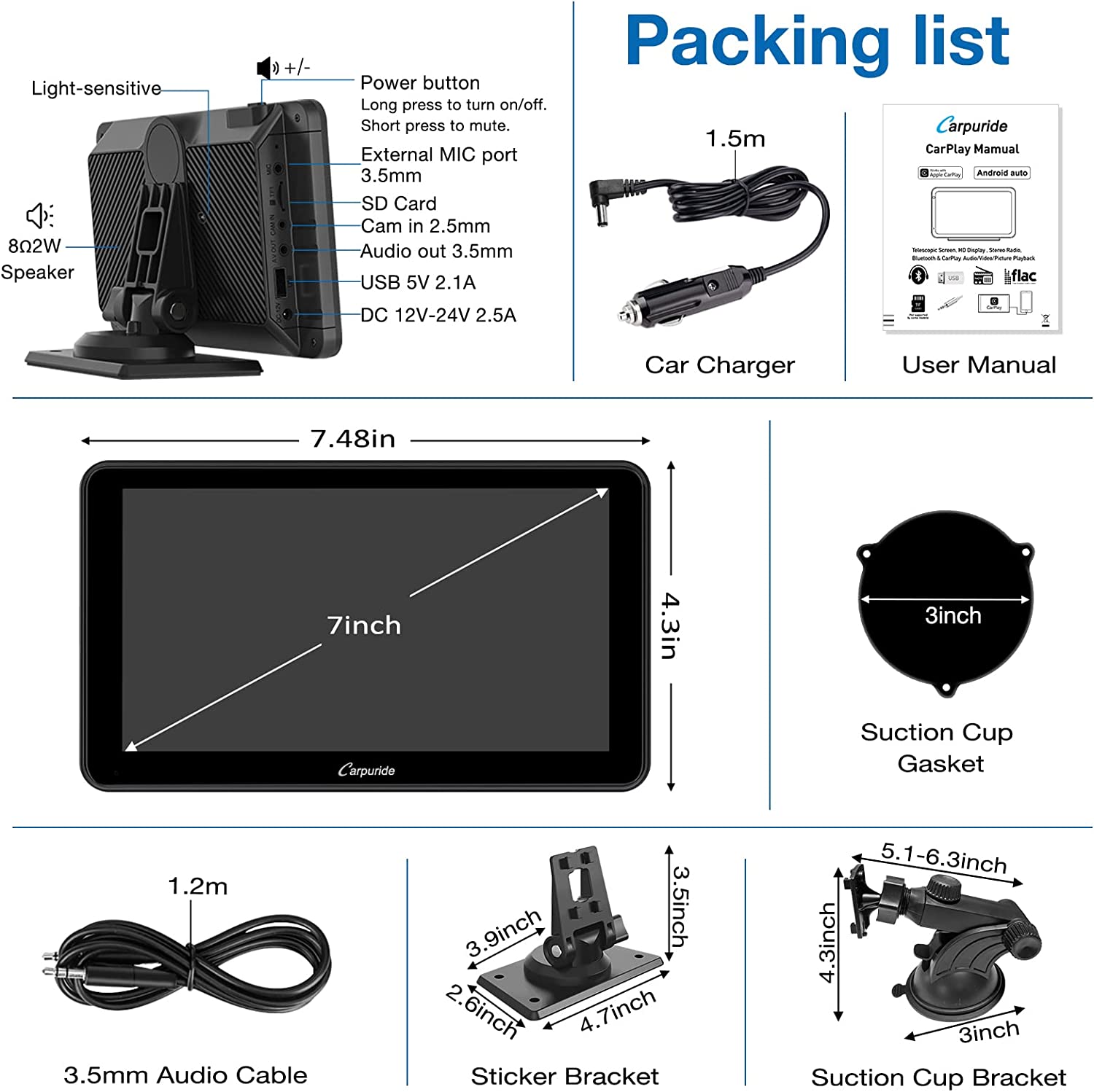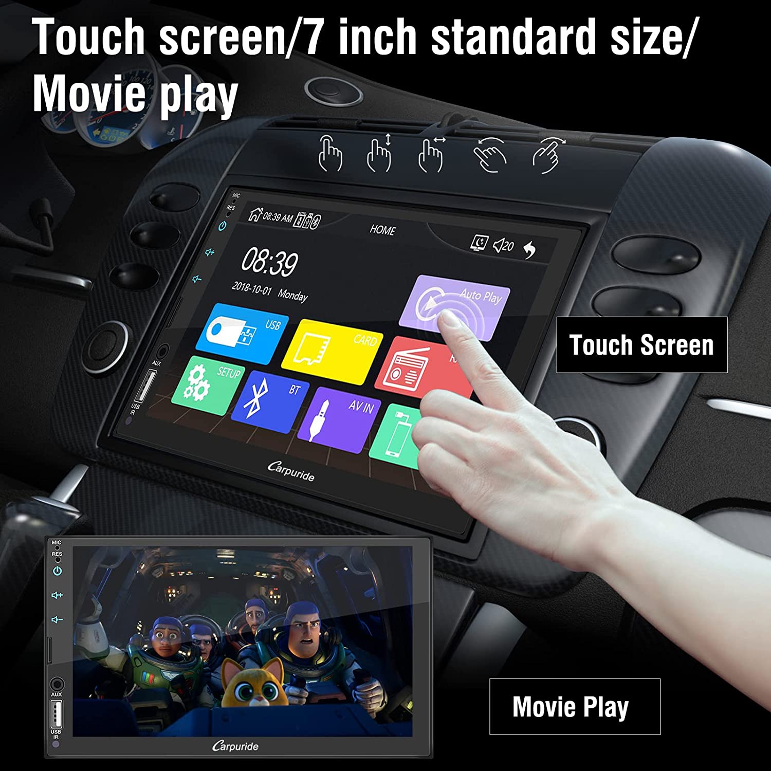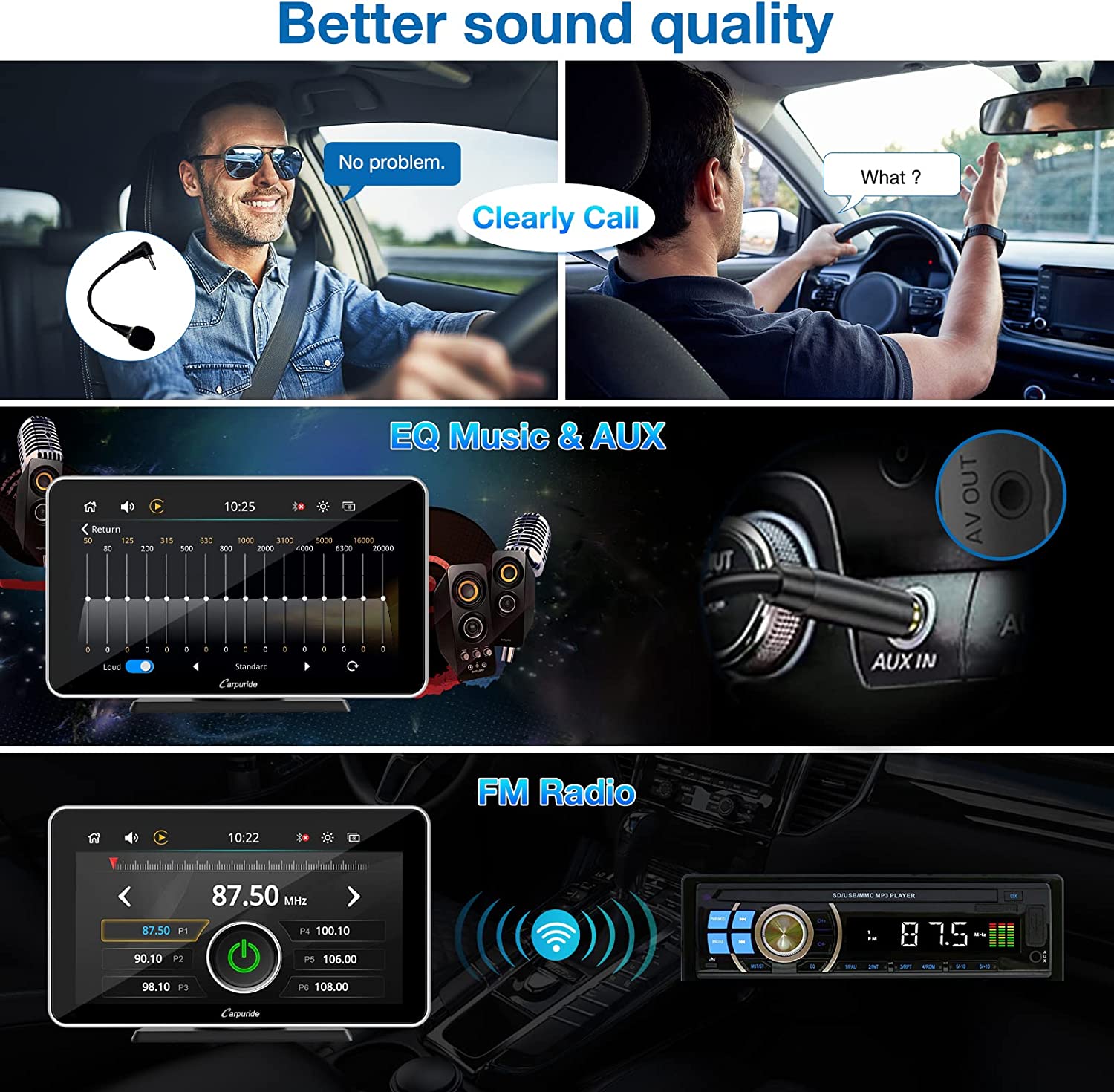 • 🚗【A/M Light Sensor & Clear Call】Sensor lights can be adjusted automatically or manually, it is designed to protect your eyes while driving. Carpuride 701 uses 2Ω8W speaker offers ultra-clear vocals to ensure clear and truly sound, also connect external microphone (3.5mm jack) allowing you to enjoy high quality conversations and music anytime, anywhere. And support the carplay EQ, automatic FM opening, Please feel free to contact us to update the software.