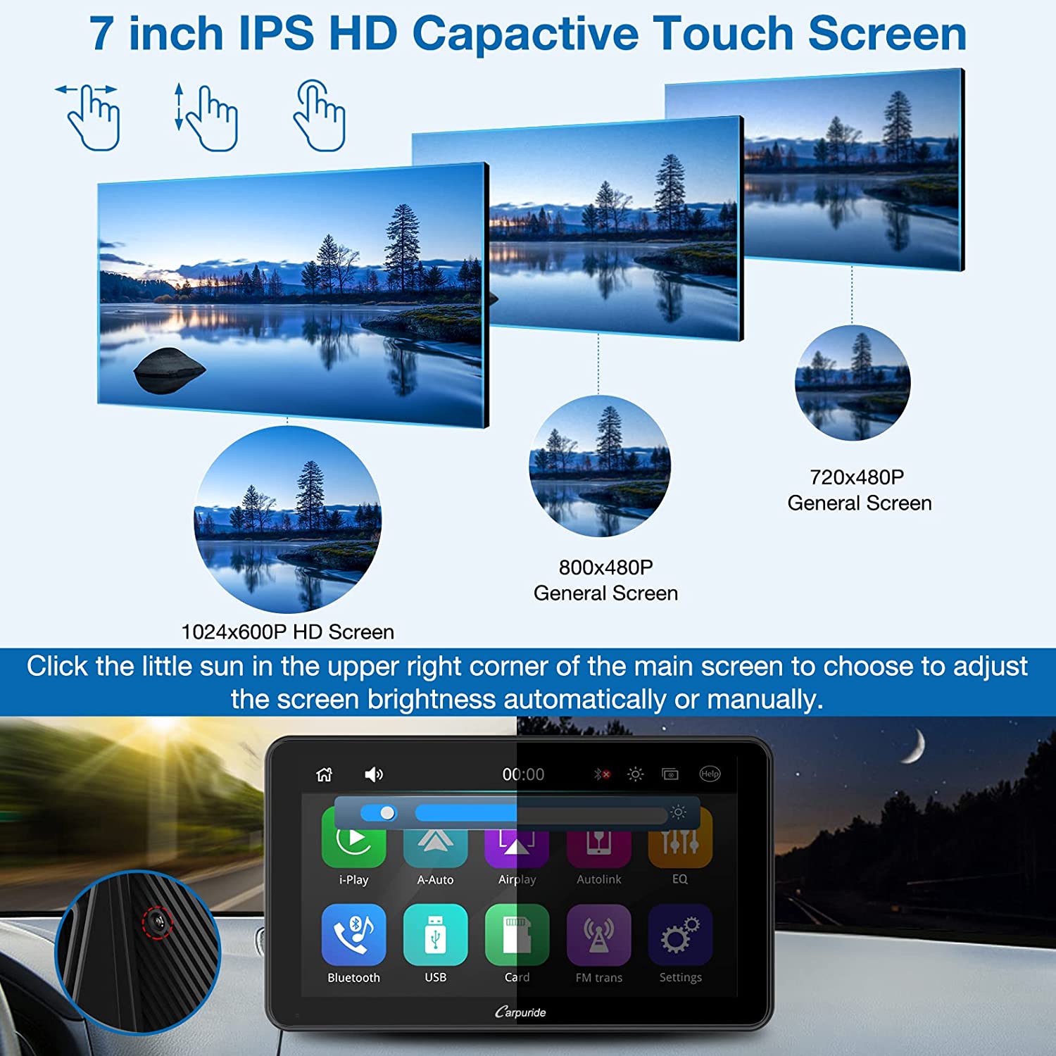 • 🚗【Android/IOS Mirror Link】This car audio systems full touch screen car radio supports all iOS and Android smartphone mirror link. Sync your maps, movies and more to the 7” big screen. The resolution 1024*600 full touch HD capacitive monitor will give you highly responsive and clear viewing experience, and you can toggle day/night mode to ensure that the brightness does not affect driving.