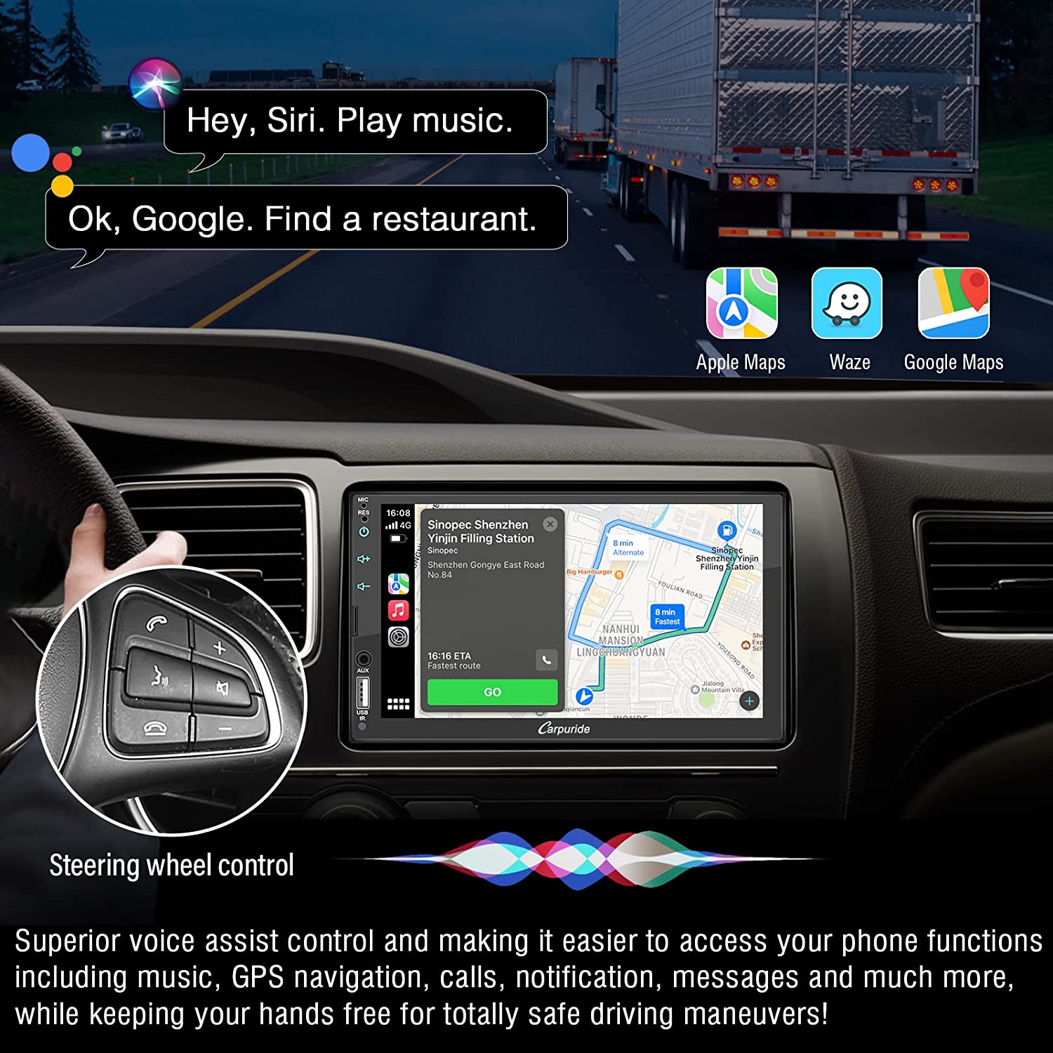 • 🚗【Easy Installation】This carplay radio can use suction lock fixes securely to your dashboard or fixed on the windshield with strong suction cup, then adjust the height and length according to personal visual habits, the base supports 360° rotation, plug and play, so you can save a lot of installation costs.