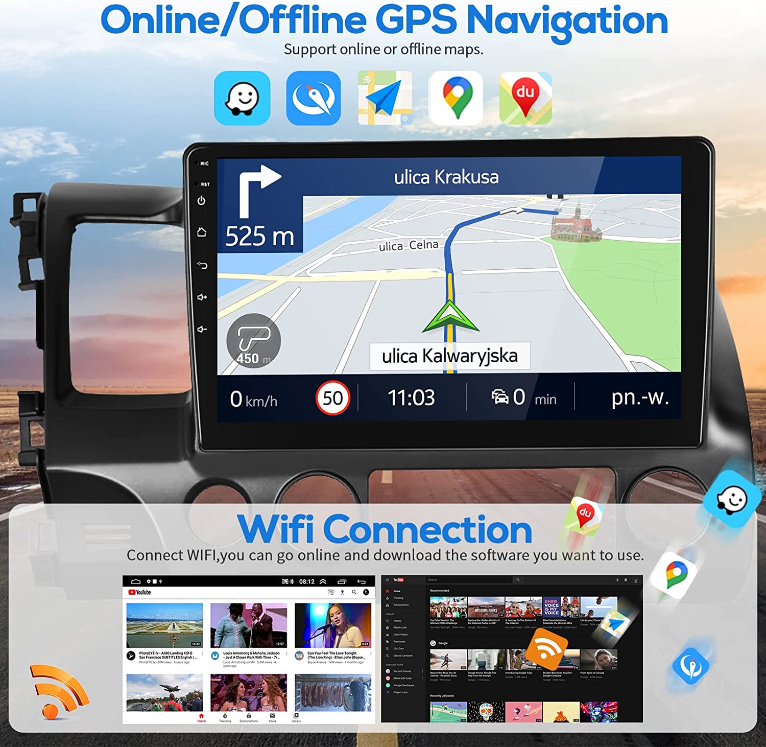 • WiFi & GPS Navigation: This android car stereo can connect to wifi or your phone's hotspot for free entertainment mode, including Twitter, Facebook, Gtalk, Gmail and other services.Then car audio can support online navigation,or download free map of any country you need (via menu - download map) for offline navigation.