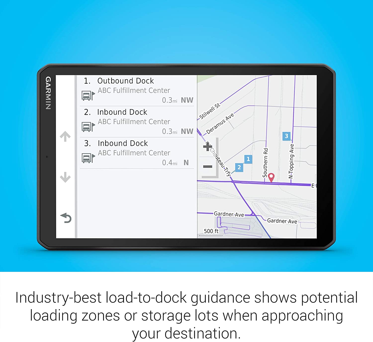 • Industry-best load-to-dock guidance shows potential loading zones or storage lots when approaching your destination