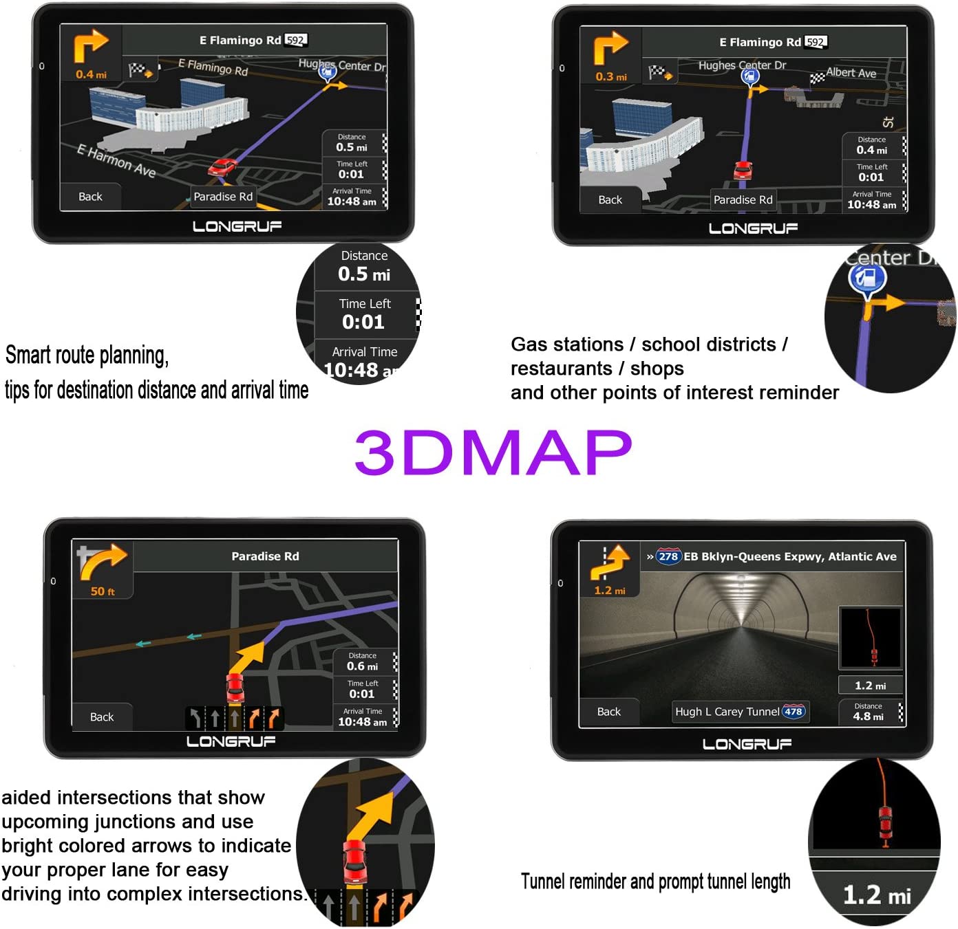 • 【Intelligent Navigation 2D/3DMaps】Flash up photorealistic, birds-eye views of junctions to help you orientate yourself as well as alert you to coming up restauarnts,hospitals,and fuel stops. All back up with Lifetime Map Updates. The 3D map display is extrenely helpful when you are driving in an unfamiliar city or area, as landmarks are very easy to pick out in a 3D map.