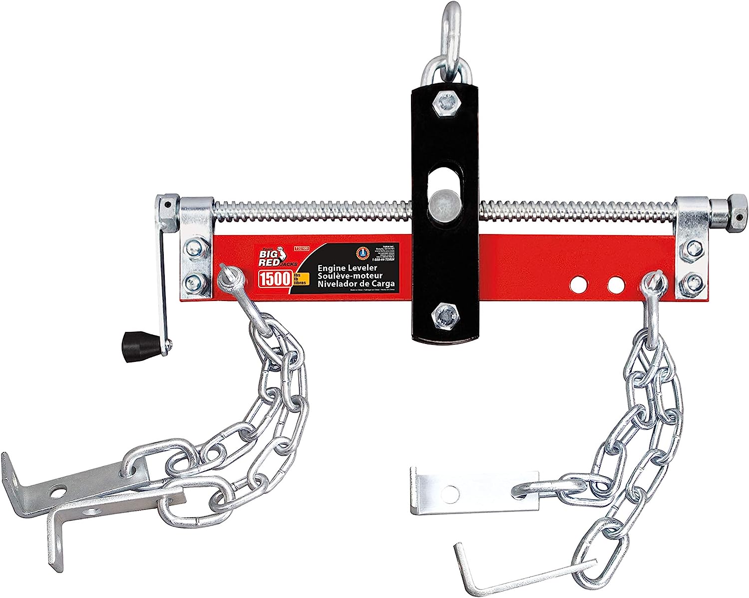 The Torin BIG RED T32100 engine hoist shop crane accessory is a 3 position steel engine leveler with an adjustable handle. With a 3/4 ton (1,500 lb) load capacity, it's ideal for garage, workshop, and agricultural jobs. Features (4) 14" length chains, each equipped with an L-bracket assembly. It's fully adjustable, with 3 position chain mount holes to accommodate various engine configurations. Simply attach the chains to the engine and use the crank handle for quick and ease adjustments with the threaded shaft, which balances the load with ease. This heavy duty engine leveler easily changes center of gravity, saving time and labor..