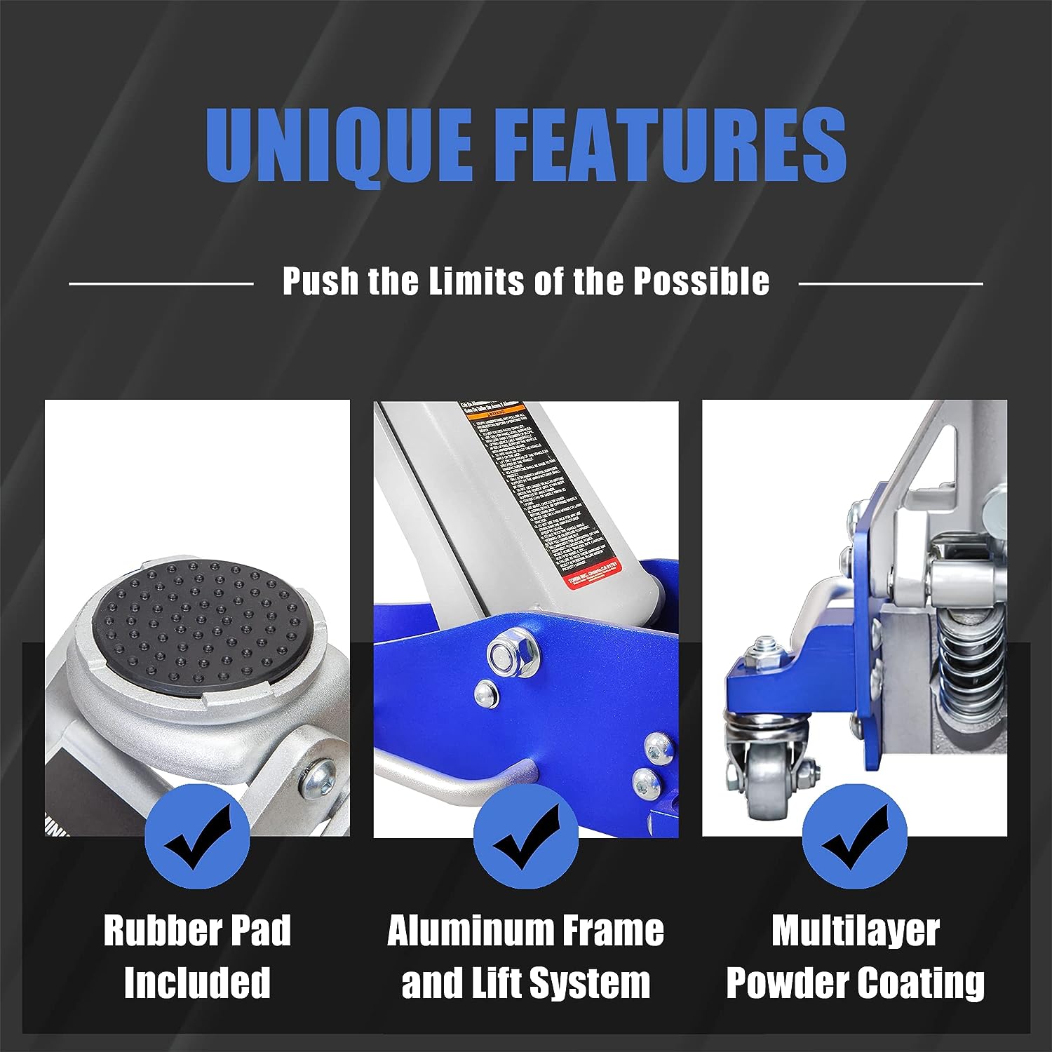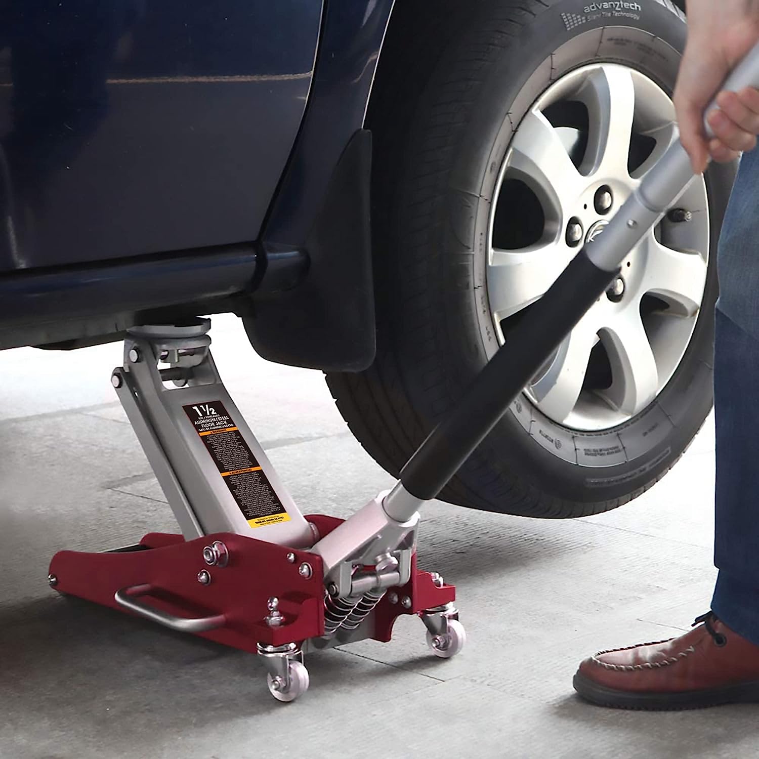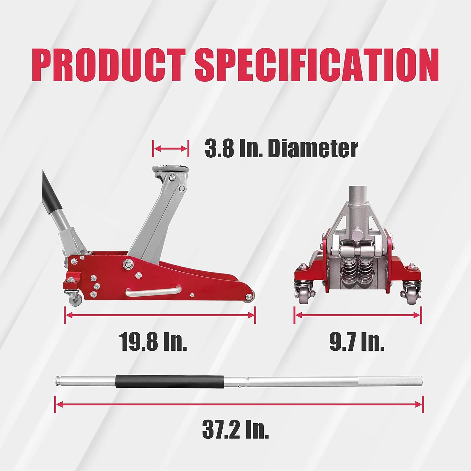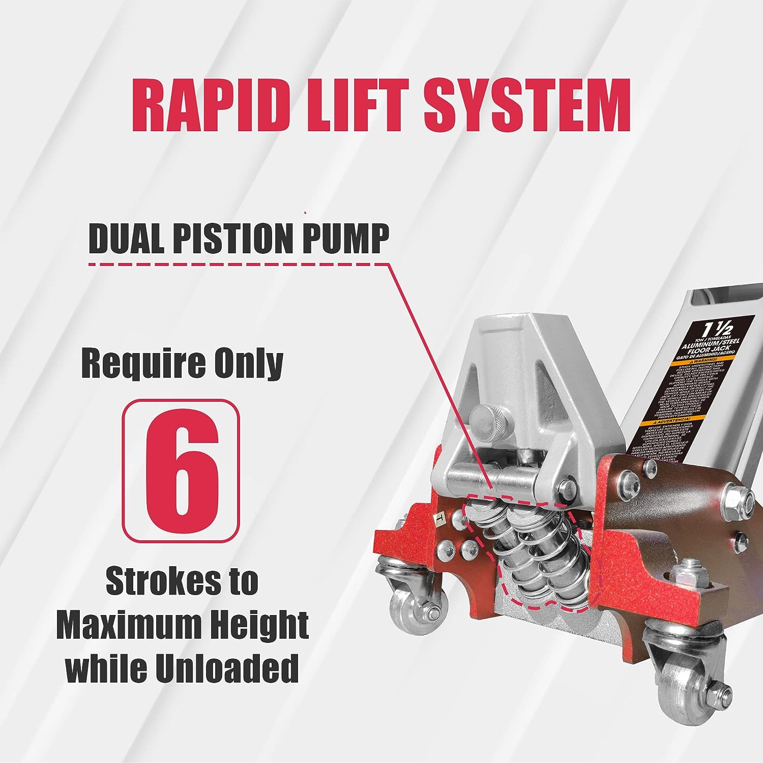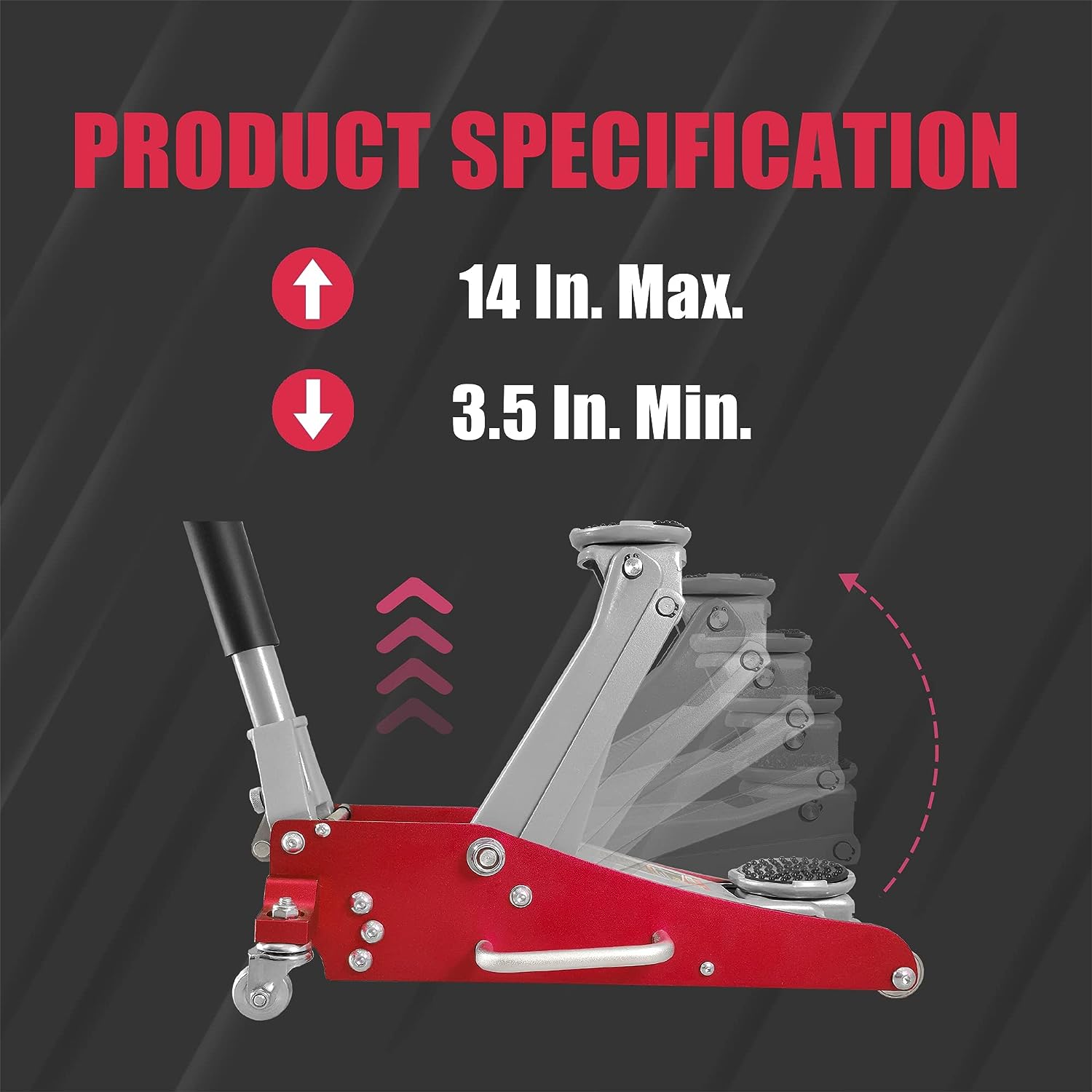 The Torin BIG RED T815016L racing floor jack can be used for general or specialty use and features a 1.5 ton (3,000 lb) capacity. With a lift range between 3.5" to 14", you can gain easy access under low-profile vehicles. It's constructed of durable, high-strength aluminum and steel, and is equipped with a handy side handle, making it easy to carry. A foam bumper on the handle helps protect your vehicle from damage. In terms of safety, this Torin service jack even comes with a built-in safety overload system which prevents use beyond load capacity..
