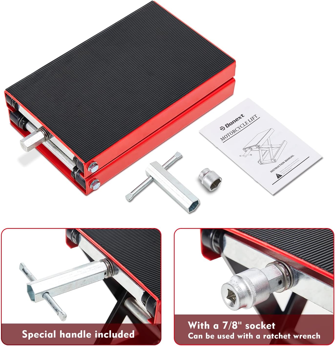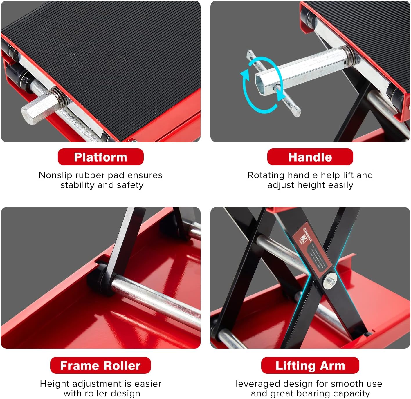 • 【Durable and lasting】The solid steel structure of the motorcycle lift jack is coated with a red powder finish that is oil-resistant, grease-resistant, and dirt-resistant, ensuring durability and longevity.