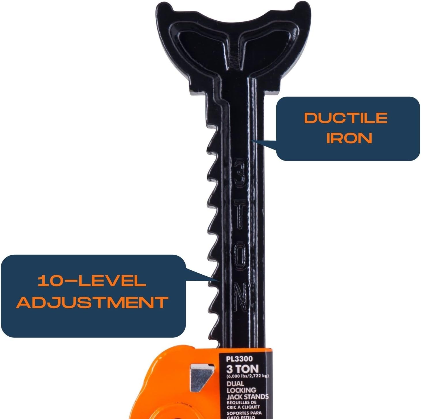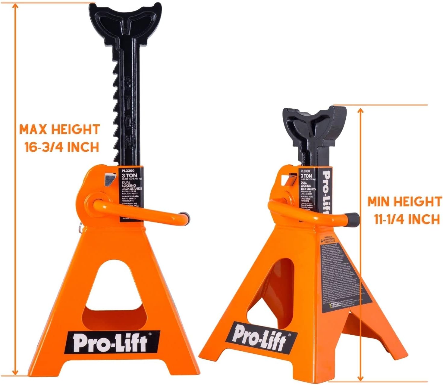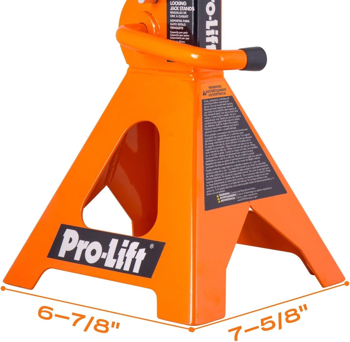 Pro lift T-6903D is a 3-ton double locking jack stands. It features a high quality cast ductile Iron Ratchet bar and sturdy stamped steel base provide durability and longevity which makes ideal for home, professional and farm use. Always used in pairs, counter weighted pawls serve as a safe secure locking device to prevent the load from accidental disengagement. An attached pin lock provides support, locking the ratchet bar in place for an additional carrying point. One-piece, multi-position ductile ratchet bar provides strength and durability as well as a quick adjustment mechanism that securely locks into the desired position.