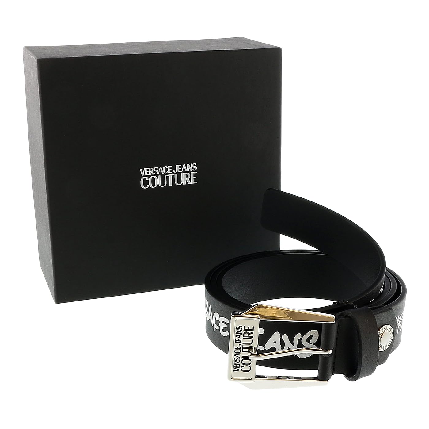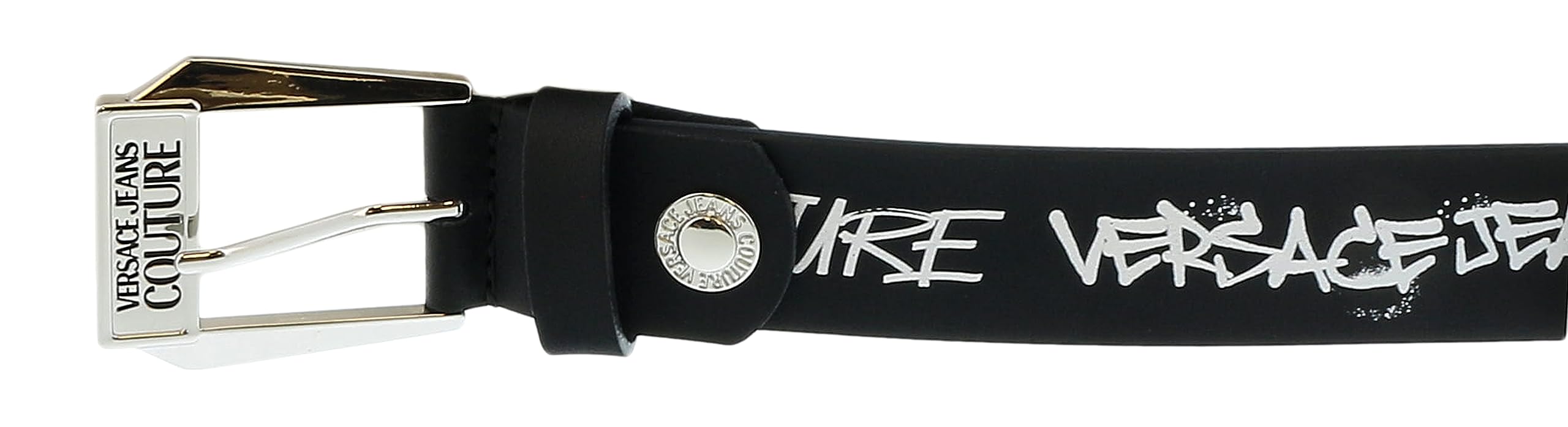 Details: Elevating a polished design with a signature buckle, this Versace Jeans Couture belt makes a sophisticated addition to any gent's accessories edit. Crafted in Italy from genuine leather, the signature lettering print belt refined piece pairs effortlessly with suiting and denim alike.