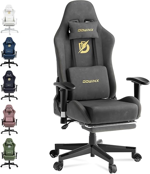Dowinx Gaming Chair with Massage Lumbar Support, Suede Fabric Ergonomic Computer Chair with Footrest for Adults, High Back Reclining Game Chair for Office Gaming, Grey