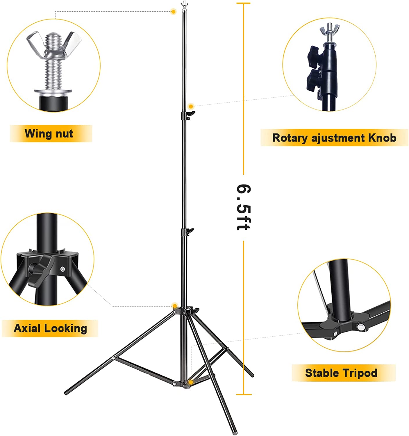 • 【BACKDROP SUPPORT KIT CONTENT】(2) x 6.5ft Tripod Stand, (4) x Crossbar, (4) x Heavy Duty Spring Clamp, (4) x Backdrop Elastic String Clip, (2) x Empty Sandbag, (1) x Carrying Bag, (1) x User Manual.