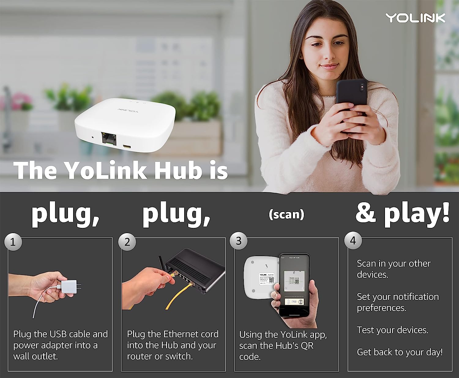 • PLUG, PLUG & PLAY! All YoLink products are designed to be easy to install, set up, and use. You can set up your Hub in a matter of minutes: plug the USB power adapter into an outlet, plug the Ethernet cord into the Hub and your router, using the app, scan the Hub's QR code, set your notification preferences, scan additional devices, and get back to your day!