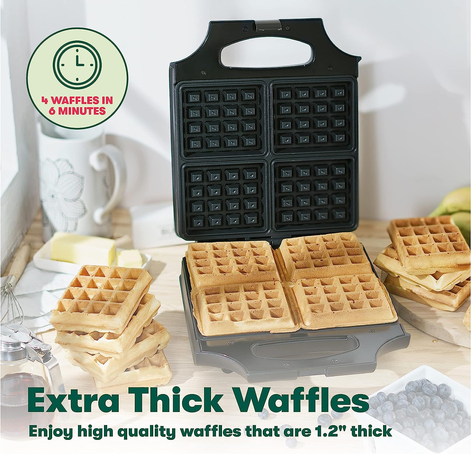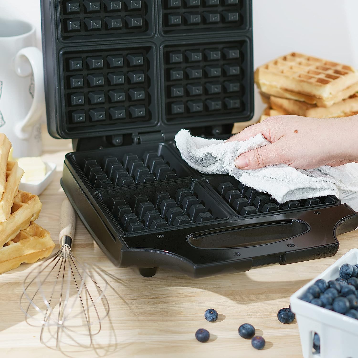Cook up to four fluffy, golden waffles at once with this easy-to-use iron for belgian waffles. The nonstick surface releases food effortlessly and makes cleaning a breeze. The built-in power and ready indicator lights let you know when the double waffle maker is hot, and the extra deep pockets accommodate a variety of toppings, such as fresh berries, melted butter, ice cream and maple syrup.
