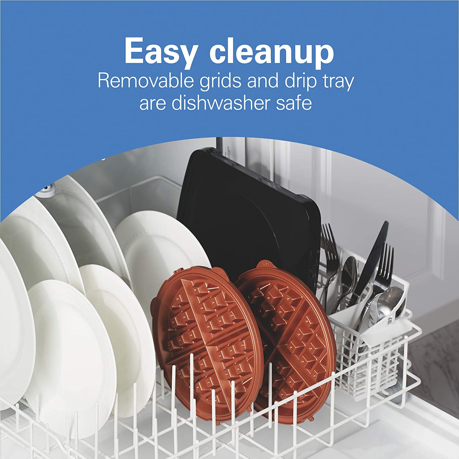 • EASY CLEANUP — REMOVABLE GRIDS AND DRIP TRAY ARE DISHWASHER SAFE. After cooking, simply let the nonstick waffle maker cool, then remove the ceramic nonstick grids and drip tray for easy cleanup in the dishwasher.