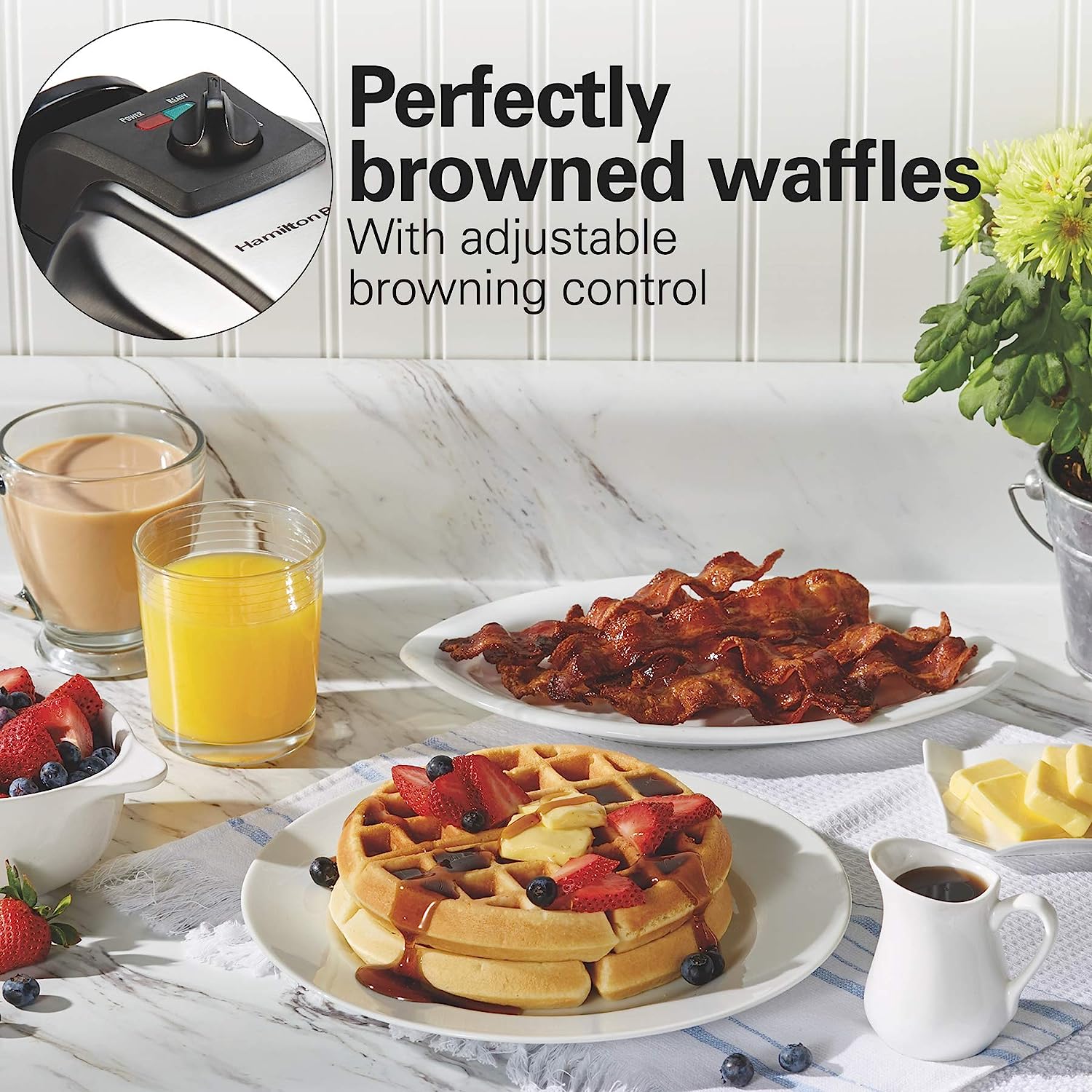 Enjoy fluffy waffles at home with the Hamilton Beach Flip Belgian waffle maker. With the ability to flip waffles during cooking, adjustable browning control and removable plates, you can create restaurant-quality results with effortless cleanup.