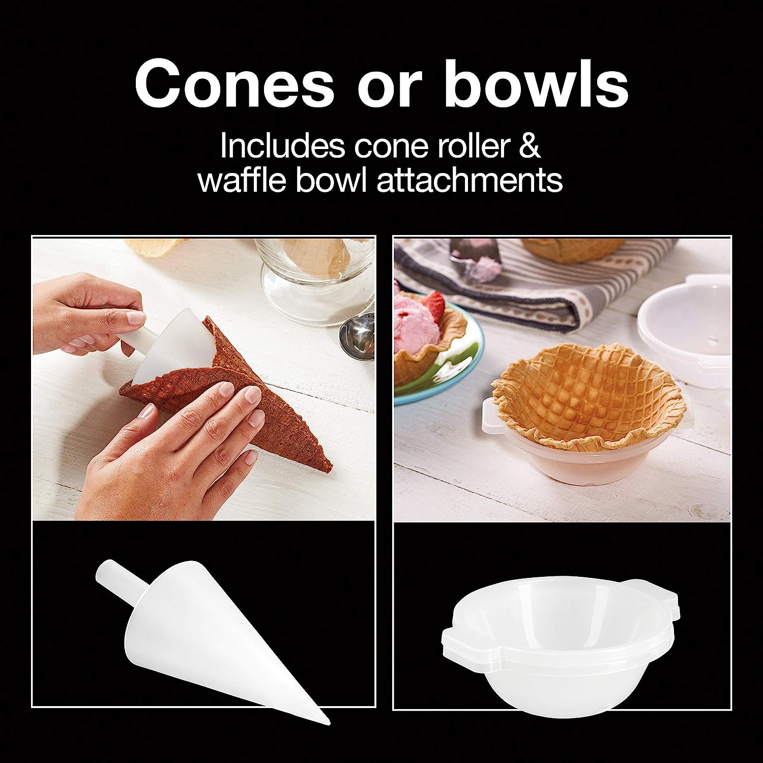 • INCLUDES WAFFLE BOWL PRESS AND CONE ROLLER ATTACHMENTS You get both attachments so you can make waffle cones and bowls for serving ice cream and other desserts Perfect for parties gatherings and family fun
