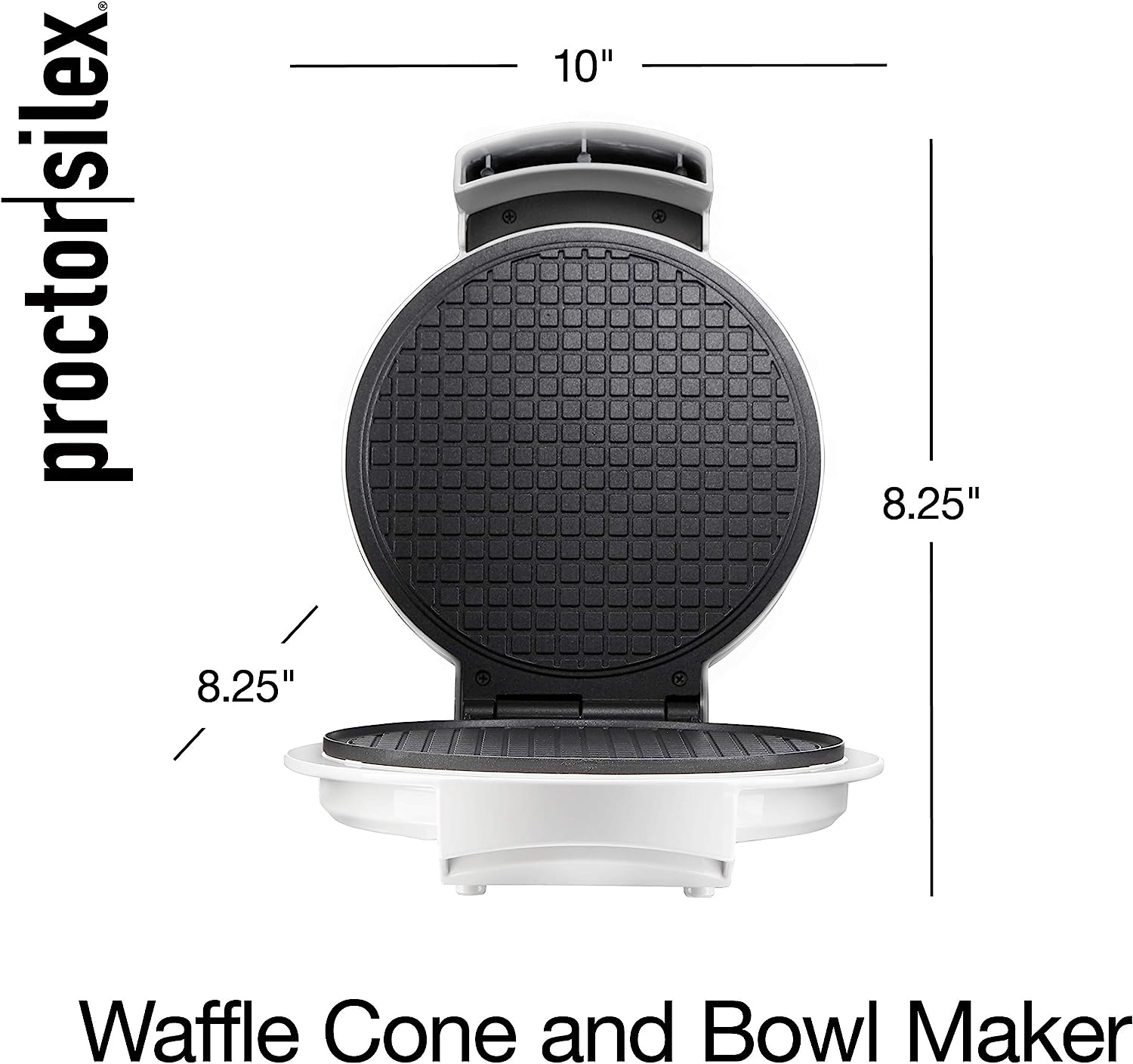 The Proctor Silex Waffle Cone and Ice Cream Bowl Maker makes delicious waffle cones and waffle bowls quickly in 2-3 minutes so there's less wait time Includes waffle bowl press and a cone roller Waffles remove easily from the 7 5” nonstick plates which are easy to clean Stores vertically