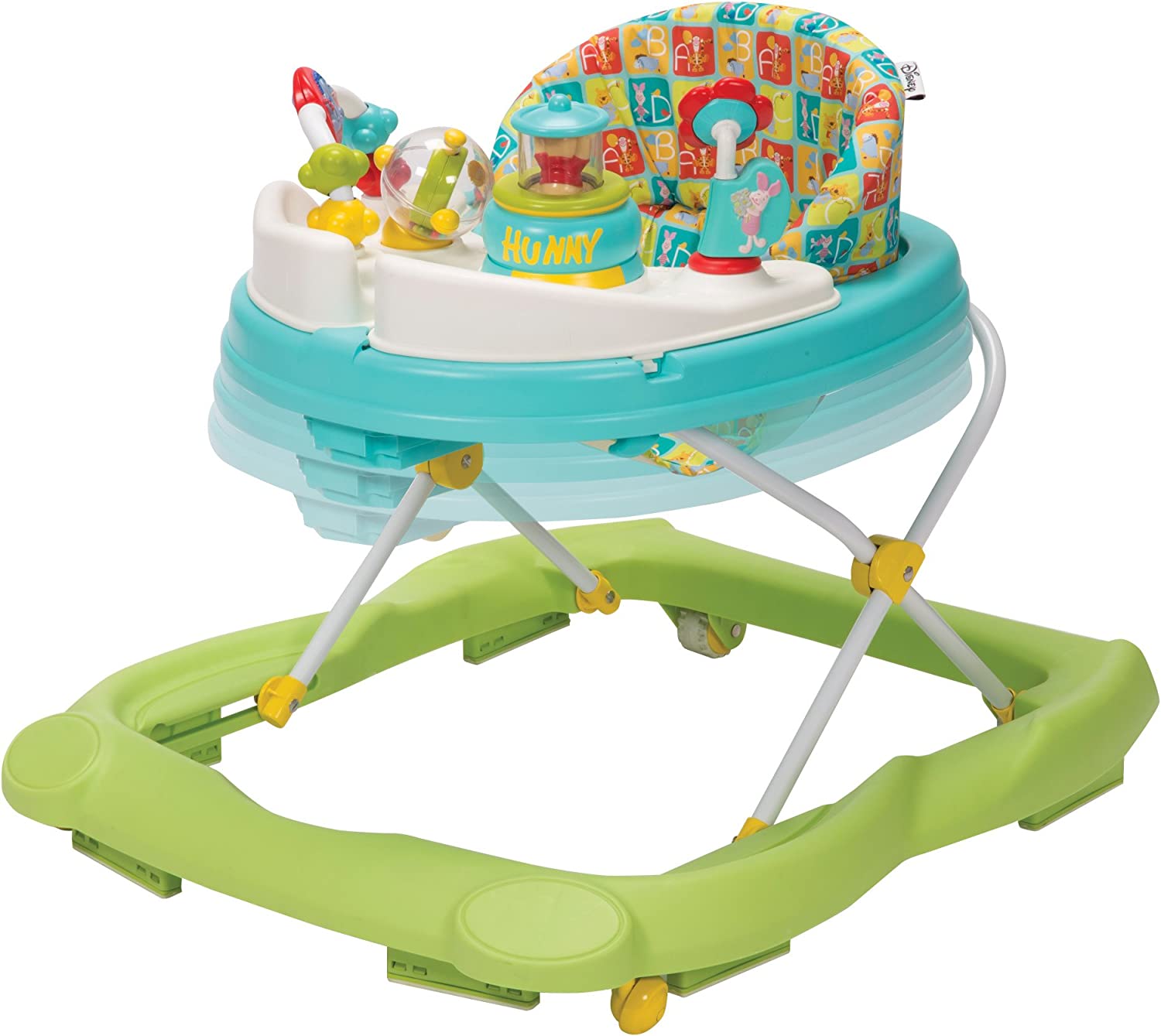 The Disney baby Winnie the pooh music & lights walker offers plenty of fun for your little one. Sturdy wheels work well on floors and carpet alike, while the grip strips reduce walker movement on uneven surfaces. The oversized play tray features the Disney characters your child loves so well and conveniently swings open to reveal a snack tray perfect for little treats or other toys. With a machine-washable padded seat, cleaning the walker is as easy as a-b-c.