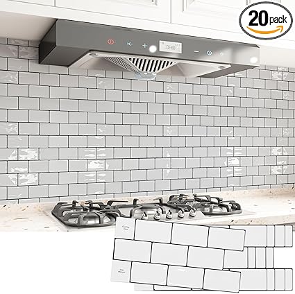 Art3d 20-Pack Kitchen Backsplash Tile Peel and Stick, Vinyl Stick On Subway Wall Tile Sticker for Bathroom Laundry Room RV Stove, 12" x 6" White with Black Grout
